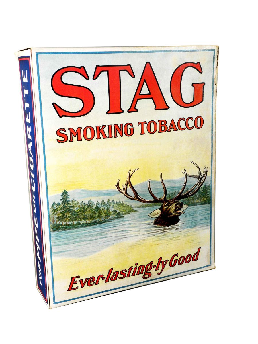 Stag Smoking Tobacco Cardboard Store Display. Tear upper right corner of front side otherwise excellent condition. 13 1/2 X 17 1/2 X 3 1/2 inches.