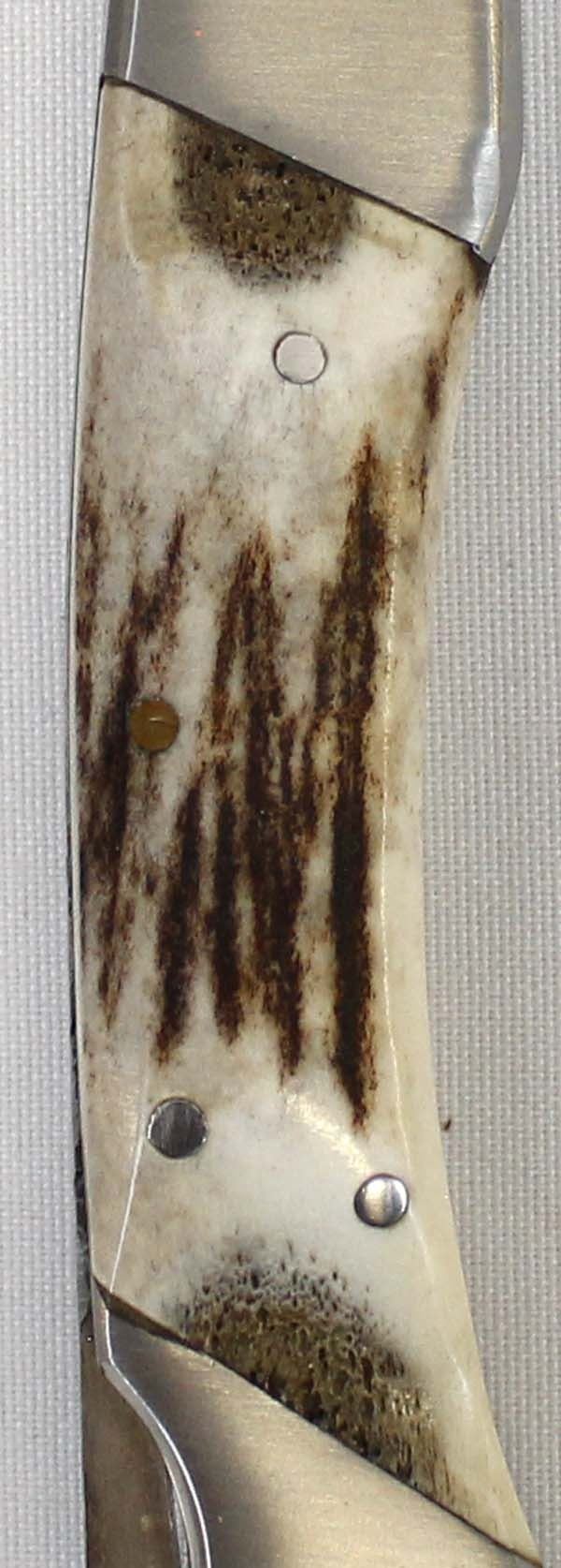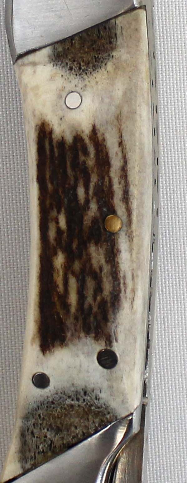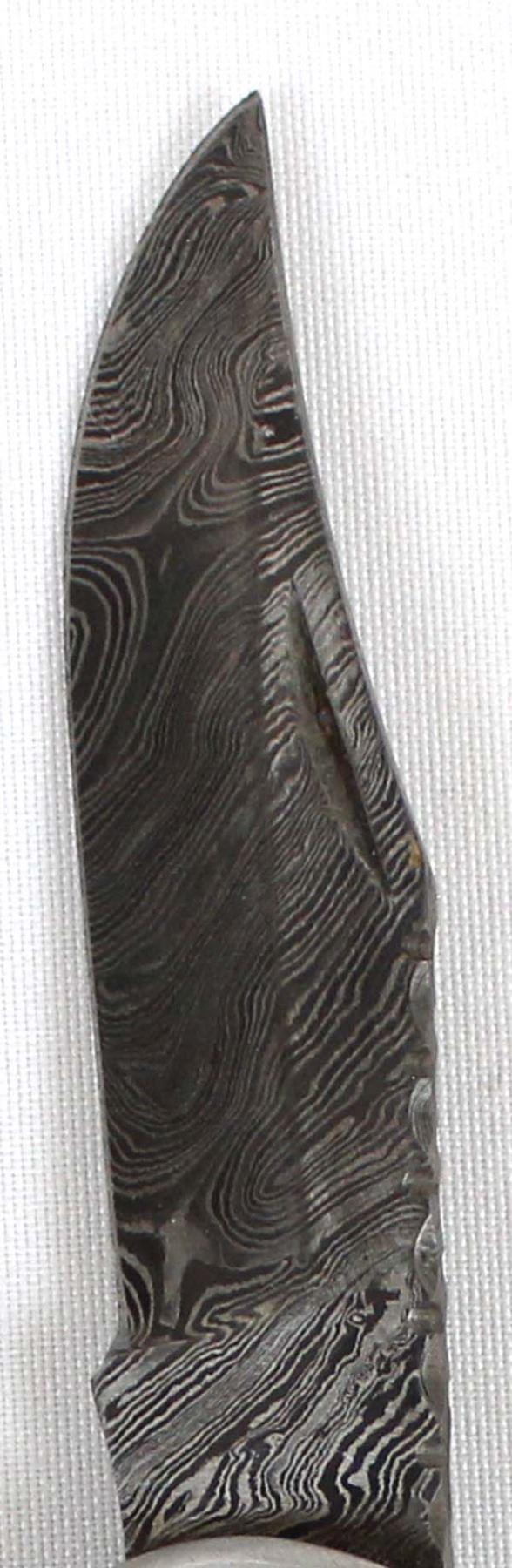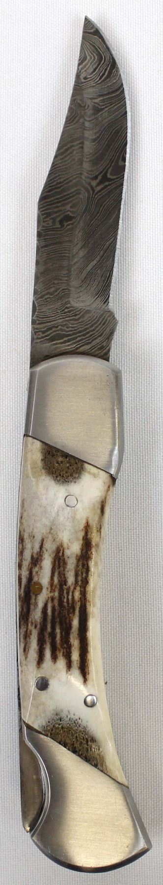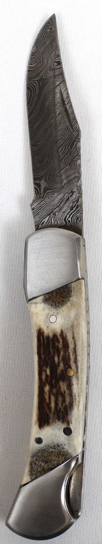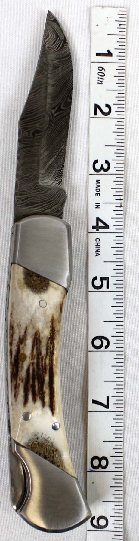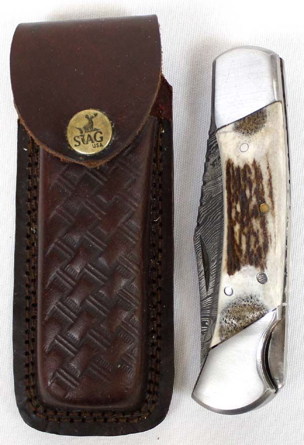 Stag USA Damascus Blade Hunters Knife with Leather Case. Blade Measures 4'' And Bone Handle is 3''.