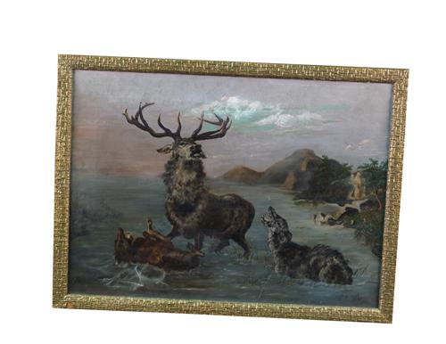 Stag & Wolf Oil Painting  19th Century  unsigned  16 x 22 "