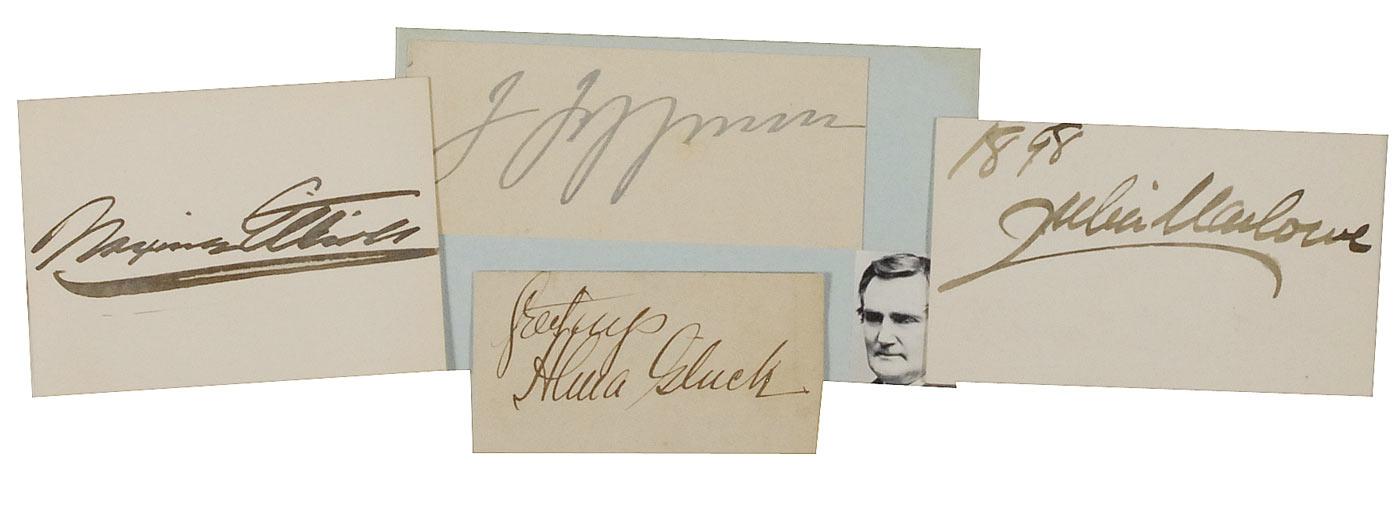 Vintage fountain pen signatures of Julia Marlowe, Alma Gluck, Maxine Elliott, and Joseph Jefferson on individual various size off-white cards, with one card affixed to a larger light blue card. Some scattered toning and soiling, otherwise fine condition.