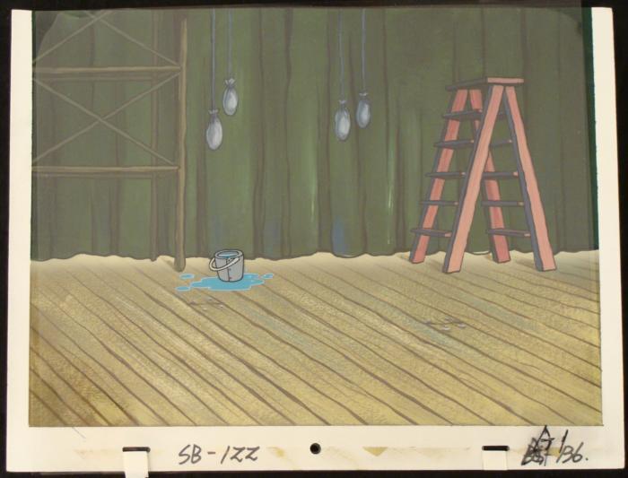 To create production cels, the original animator's drawing is transferred onto an acetate cel (by hand-inking and/or photo copying). The cel is then hand-painted on the reverse side. The background accompanying this set-up is a hand-painted original production background. The background is ready to be matted and framed. It is a colored background with a cel and has the animator's notations at the bottom of the background and the cel. This cel has multiple layers; first the bucket of water, and the second is the spilled water. The cels have been taped to the background