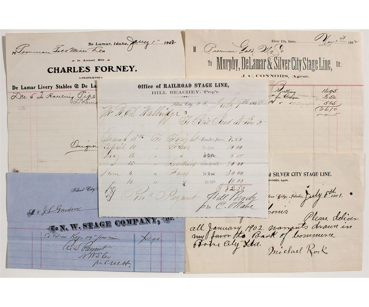 1868 Lot of 5 pieces. 1) Railroad Stage Line invoice, Hill Beachey, Prop’r. Dated July 1, 1868, datelined Silver City, Idaho Territory. Hilary “Hill” Beachy (1822-1875) was a colorful character who operated numerous stage lines in Idaho and Nevada, sometimes with the help of his nephew William C. Beachy, with whom he is often confused. He operated the Luna House hotel in Lewiston, ID from 1852-1865, when he started a line of stages [Ref: findagrave.com]. 2) N.W. Stage Company billhead, Silver City, I.T., March 19, 1872. 3) Murphy, DeLamar and Silver City Stage Line, J.C. Connors, Agent, Silver City, ID, July 8, 1901, note to E.L. Balland. 4. Murphy, DeLamar & Silver City Stage Line invoice, Nov. 1, 1902. 5) Charles Forney, Proprietor billhead, from the DeLamar Livery Stables & DeLamar & Silver City Stage Line, datelined DeLamar, ID, Jan. 1, 1902. Attached is an accounts payable invoice from the Poorman Gold Mines. Lynn Langdon Collection - HKA#66269