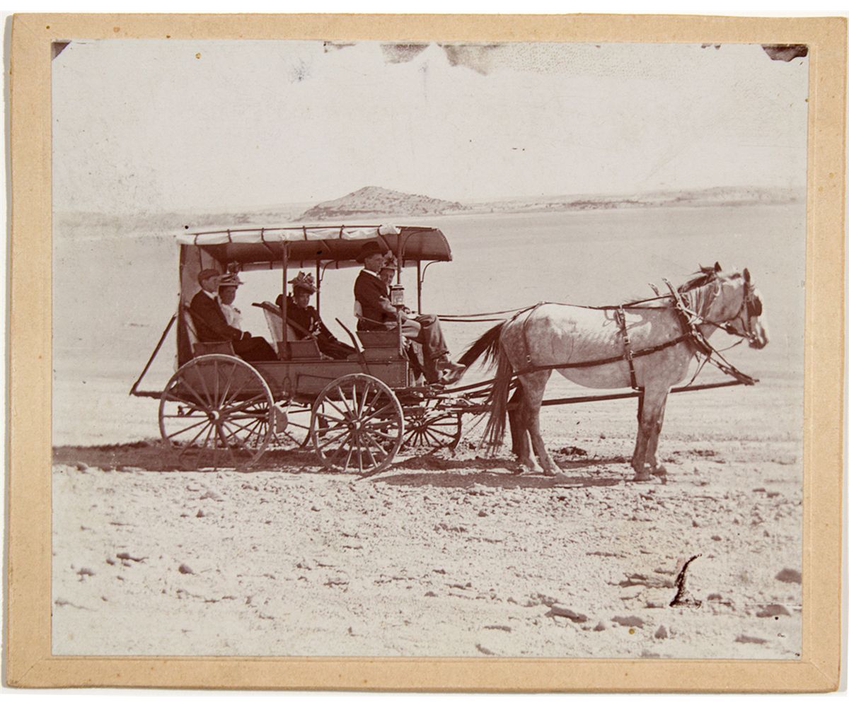 c1905 A wonderful photo of 2 men and 3 women in a canopy-covered, open-sided carriage, harnessed to 2 horses. The coach is standing on an open desert playa, very barren. A small hill shows in the background. 4 x 4.5” on a cardboard backing. - HKA#65668