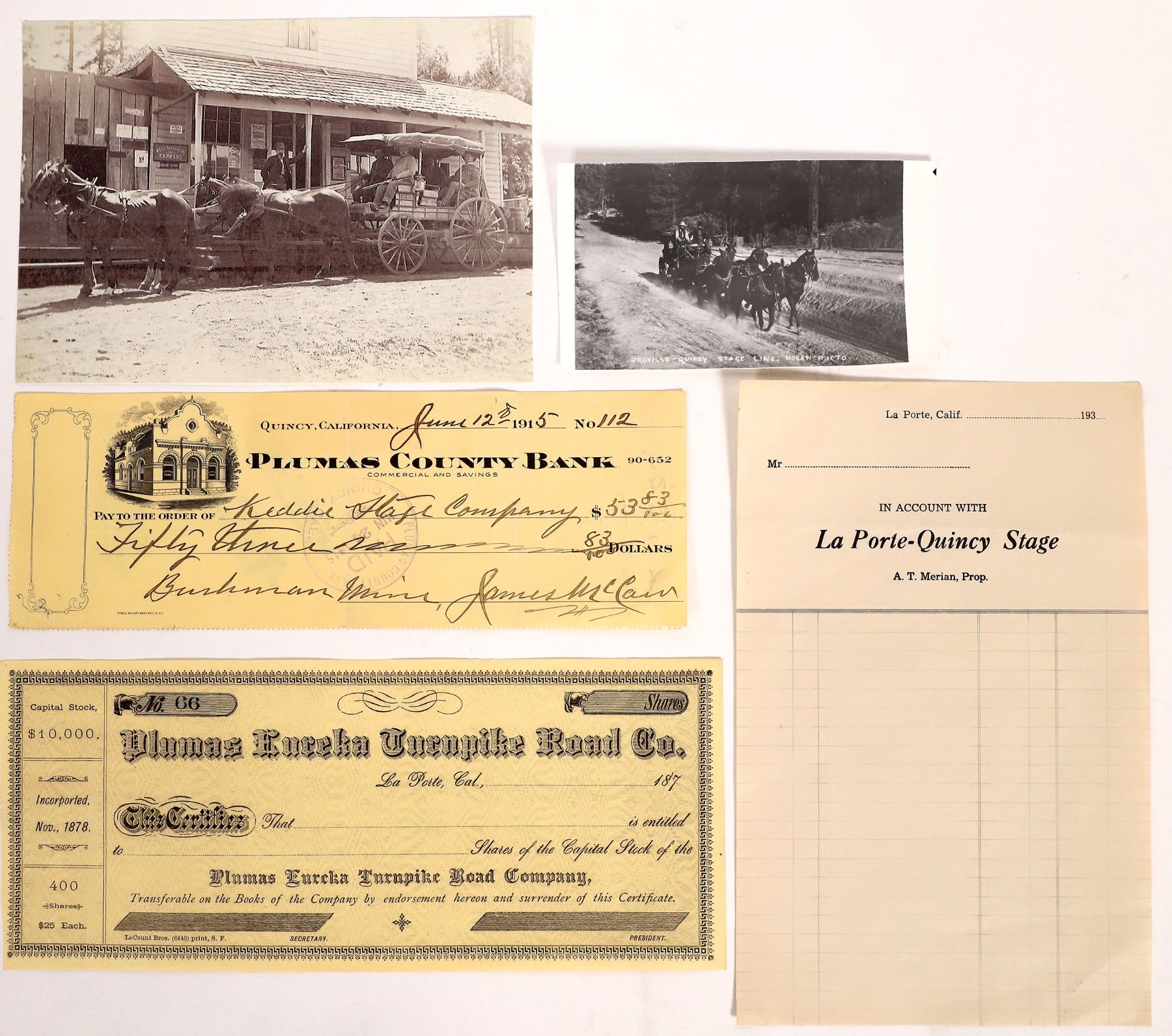 5x documents out of Quincy/La Porte areas, including 2x photographs: 1) Copy of Photograph taken of a 4-horse stage coach with 4 passengers, in front of Wells Fargo and Co. building. Not dated. 2) Copy of a photograph taken of a stage coach titled, Oroville-Quincy Stage Line, Hogan-Photo, showing a 6-horse coach with 2 drivers. Not dated. 3) Plumas Eureka Turnpike Road Company, Cert. #66, 187-, incorporated 1878 with 400shares at $25 each. Unissued. Black border and print on cream paper by LeCount Bros. print, SF. 4) Plumas County Bank Check #112 for $53.83 issued to Keddie Hage Company, signed by James McCann from the Burkman Mine on June 12, 1915 in Quincy, CA. Vignette of bank building top left, black print on beige paper by Mysell-Rollins Bank Note Co., SF. 5) La Porte-Quincy Stage, A.T. Merian, Prop., accounting page, unused, dated 193-. Garvis Collection.