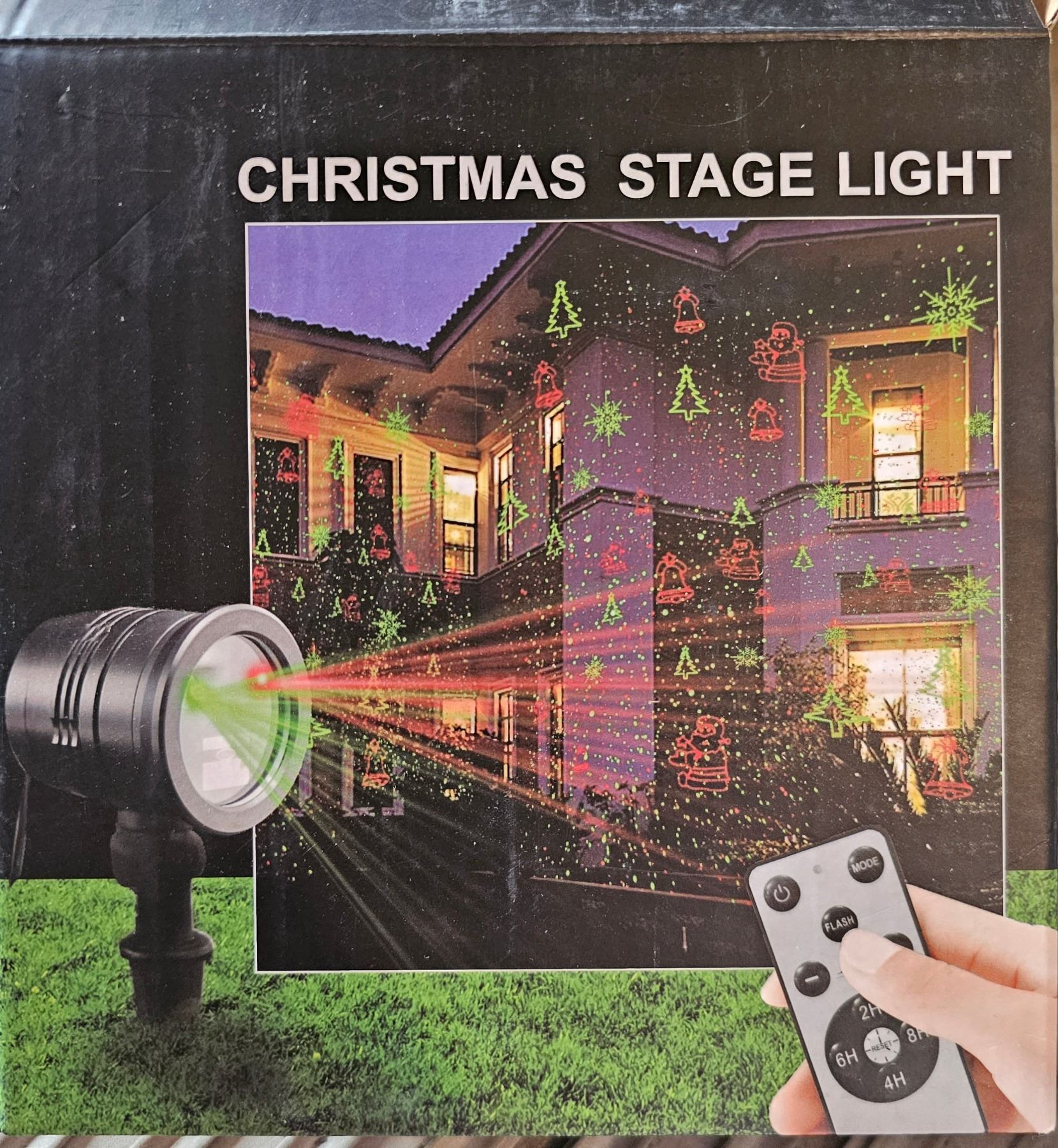 Christmas Stage Light, Red/Green Colors, Plus Shapes Of Snowman, Santa, Trees, Snowflakes, With Remote Control, Open Box, Like New Condition