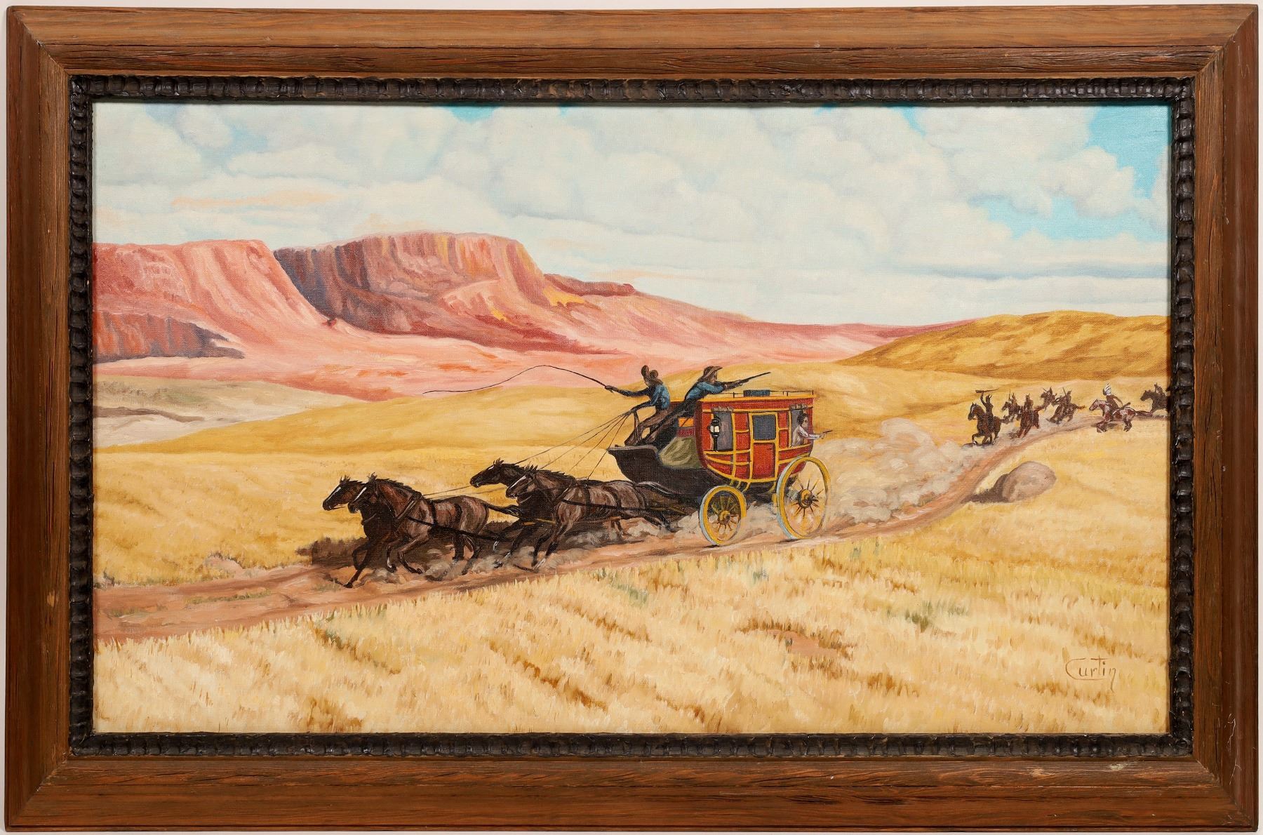 Nice piece of original, signed artwork. Oil on Canvas. Measures 25" x 40" with rustic frame. Western Frontier painting of a stagecoach pursued by mounted Plains Indians. Signed "Curtin" lower right corner. The signature resembles that of famous Vermont landscape artist, Thomas R. Curtin (1899-1977), but does not include the artists full name, as expected on his original artwork. The subject matter and style are also not consistent with Thomas Curtain's other works. This piece strongly resembles the famous 1912 piece by Richard Lorenz, titled: Stagecoach Pursued by Mounted Indians".