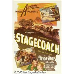 <B>Stagecoach (United Artists, R-1944)</B></I> One Sheet (27" X 41"). This classic John Ford western brought stardom to John Wayne after almost ten years of struggling in B westerns. The original one sheet, though pretty, did not picture Wayne. This early reissue is considered by many to be the best poster on the title. This poster is linen backed and has had fold line touchup and some minor border chipping issues. It looks wonderful and the colors are vibrant. Very Fine.
