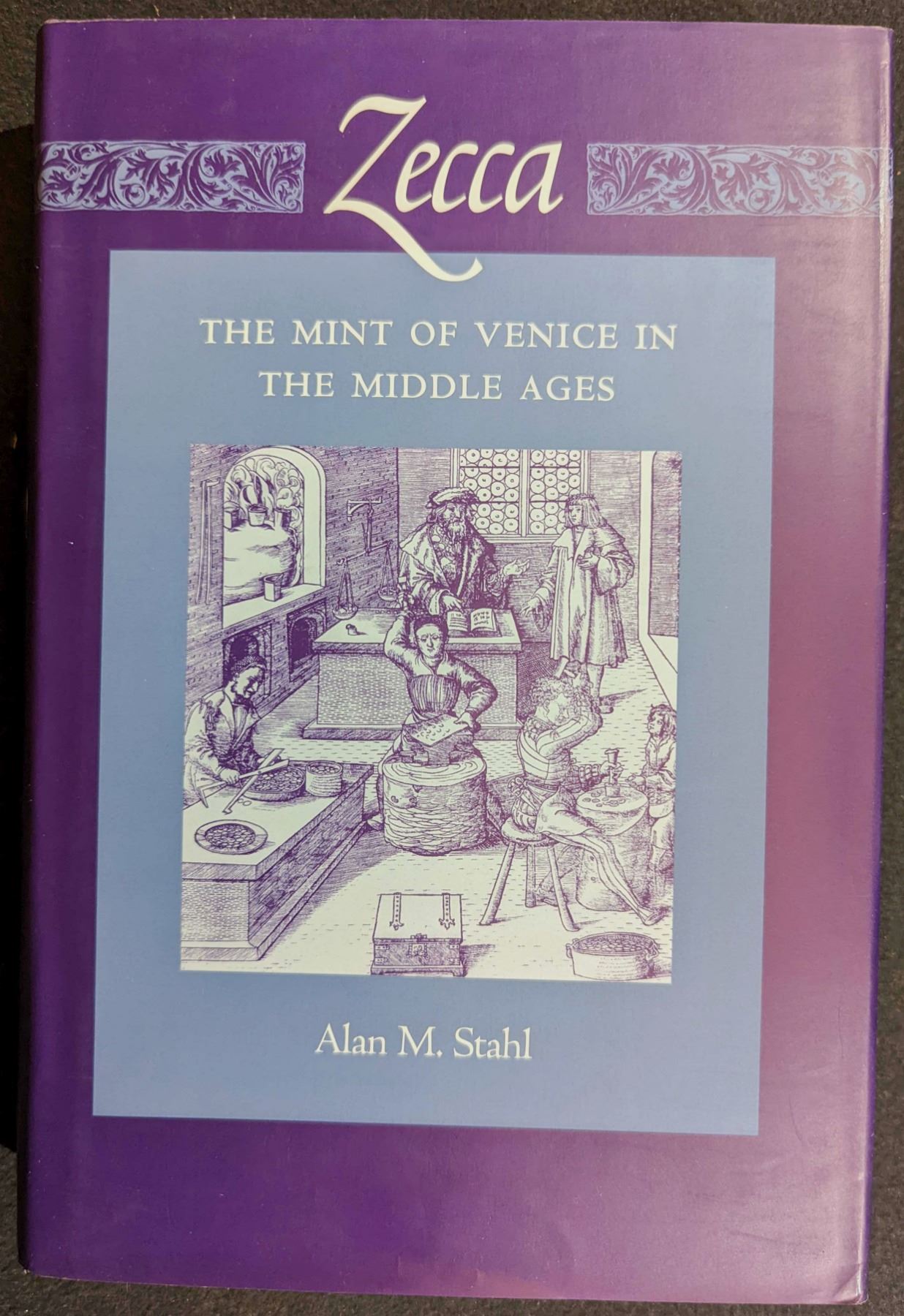 Stahl, Alan M. ZECCA - THE MINT OF VENICE IN THE MIDDLE AGES. The Johns Hopkins University Press in association with the American Numismatic Society. 2000. 8vo. 497 pages. Original purple cloth, lettered in silver. dust jacket. 25 b&w figures, 7 maps. Fine. This book is the first to examine the workings of a premodern mint using extensive research in original documents as well as detailed study of the coins themselves. The first of the book's three sections traces the coinage of Venice from its origins in the ninth century as a minor, and unofficial, regional Italian coinage to its position at the dawn of the Renaissance as the dominant currency of Mediterranean trade. The second section, entitled "The Mint in the Life of Medieval Venice," illustrates the mechanisms of the control of bullion and the strategies for mint profit and explores the mint's role in Venetian trade and the emergence of a bureaucratized government. The third section, "Within the Mint," examines the physical operations that transformed raw bullion into coins and identifies the personnel of the mint, situating the holders of each position in the context of their social and professional backgrounds. Illustrated with photos of Venetian coinage from the world's major collections, Zecca also includes a listing of all holders of offices related to the medieval Venetian mint and summaries of all major finds of medieval Venetian coins. Winner of the Professional/Scholarly Publishing Award in Economics from the Association of American Publishers. Lot weight: 1lb 14oz. Subject(s): Italian Mint History.