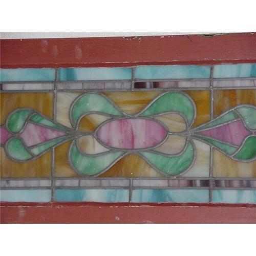 A turn of the 20th century leaded stain glass window, in the original frame, 33" long, 14" wide, likely a transom window, there is a clear glass covering on one side, the side that is painted red, for protection from the exterior conditions. One of the blue border panels is cracked otherwise the glass is undamaged and a very nice combination of colors. (15)