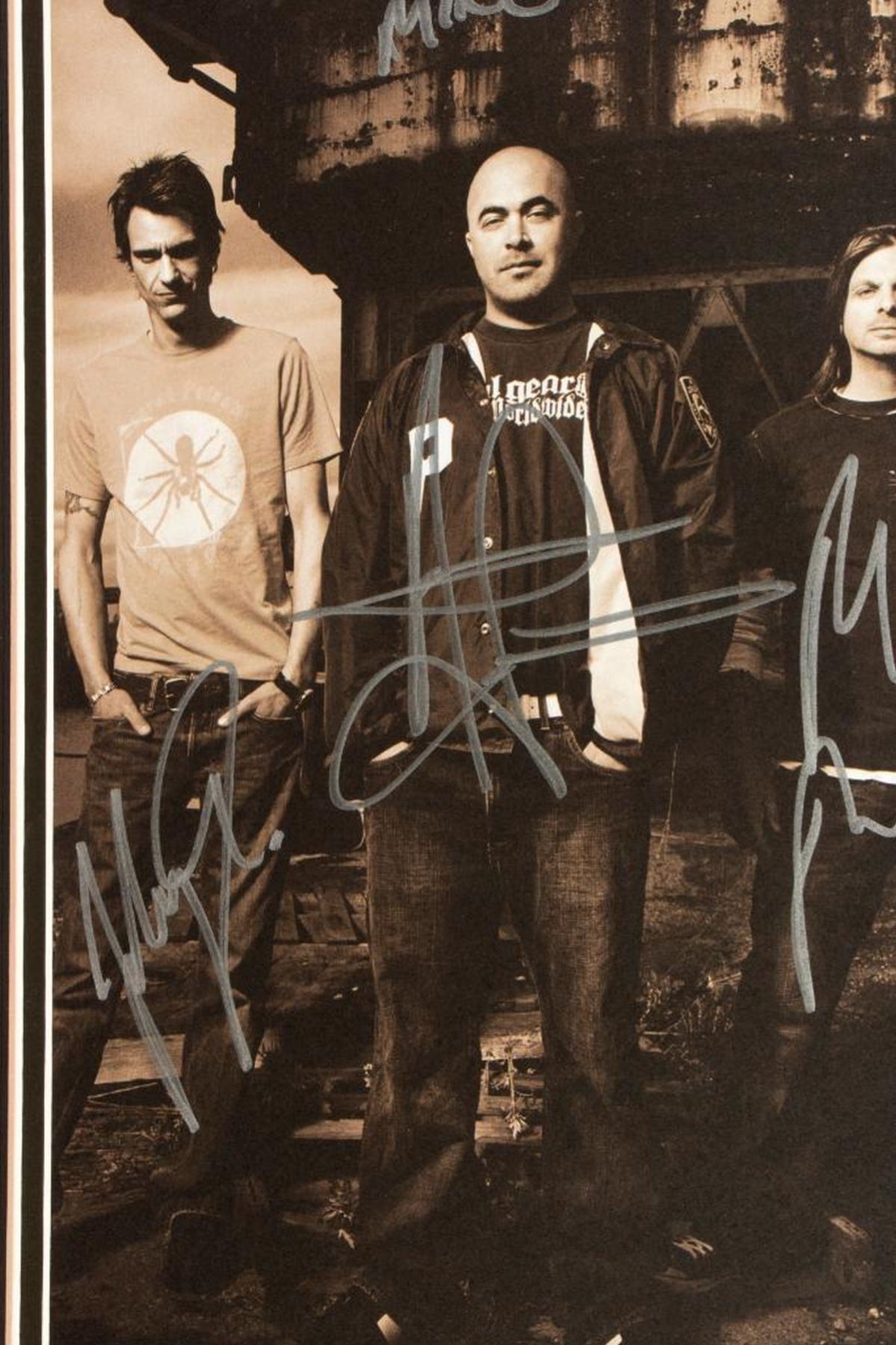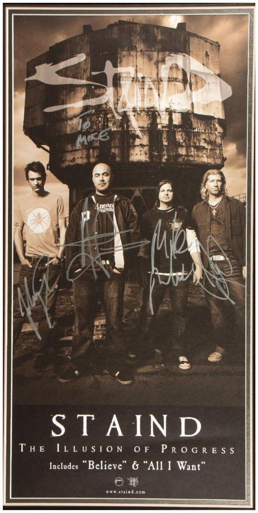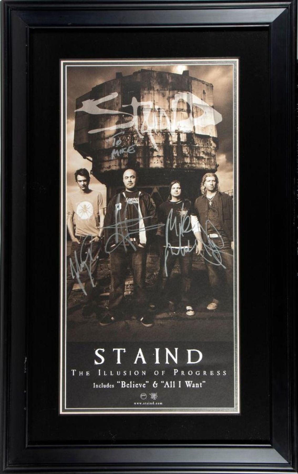 Staind framed and band signed poster. Frame: 32 1/2 x 20 1/2 inches. Depth: 1 inch.