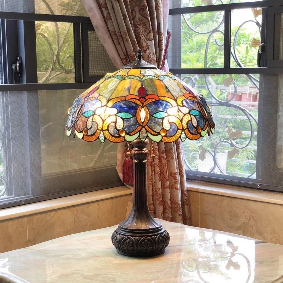 Antique-style 2-light stained art glass table lamp, created using 340 pieces of stained art glass & 60 glass beads, wrapped in copper foil. 24" H X 17" W shade.Â