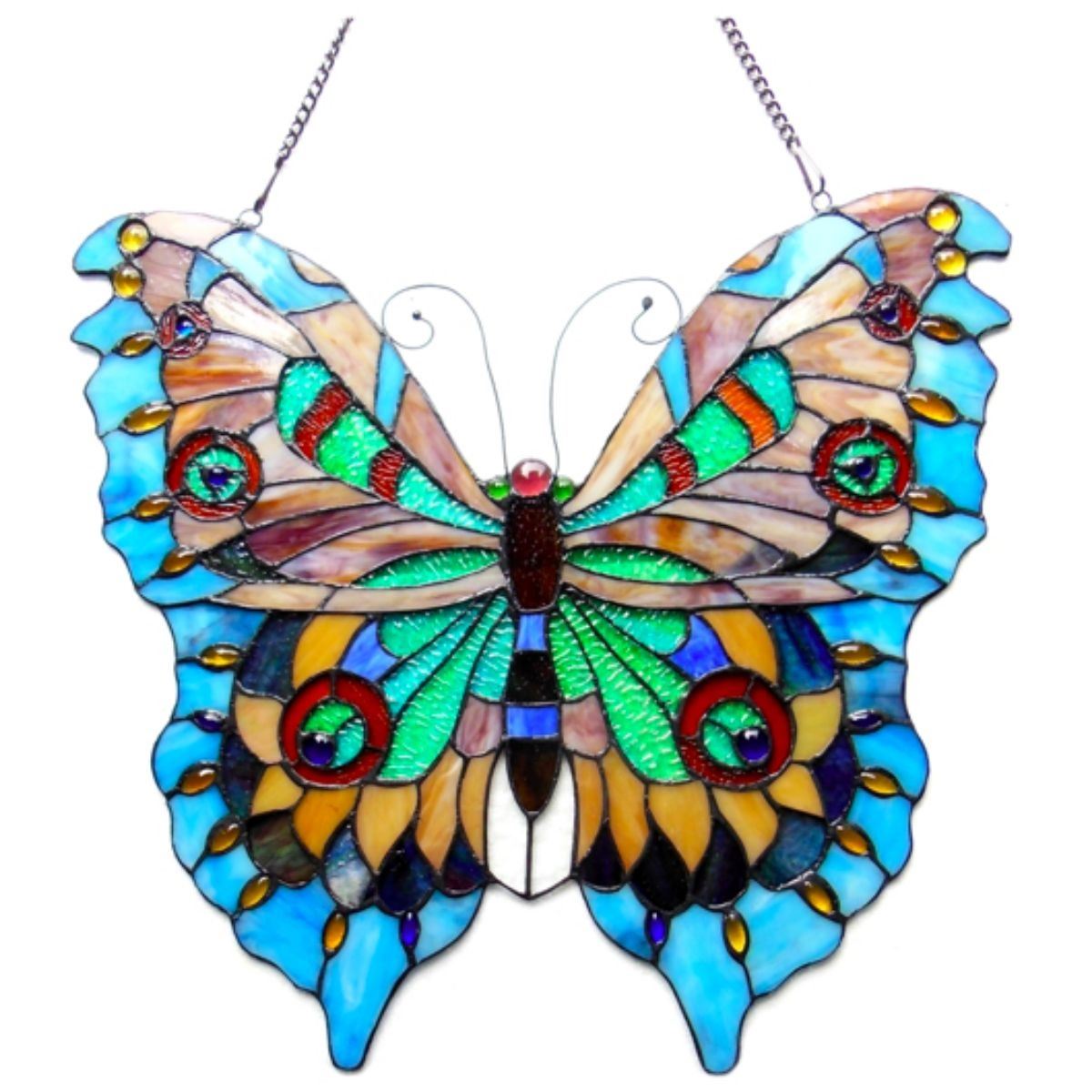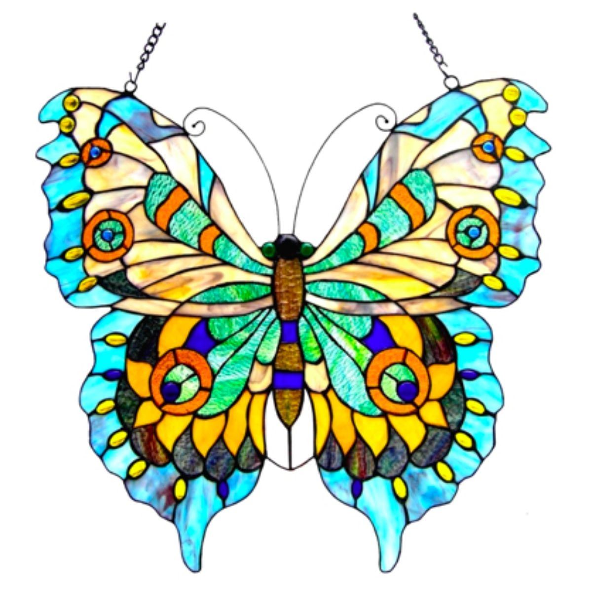 Stained art glass butterfly hanging window, created with 22l pieces of stained art glass & 35 glass beads. 21" H X 20" W. Comes with hanging chain.Â