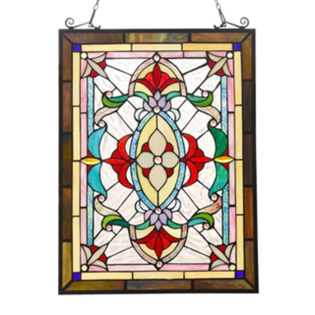 Stained art glass hanging window panel, with over 200 pieces of stained art glass, glass beads & crystals, wrapped in copper foil. Comes with hanging chain. 18" W X 24 1/2" L.Â