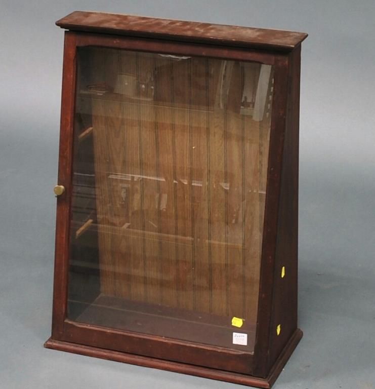 Stained Birch Slant-front Counter Display Cabinet, 20th century, with chamfered glazed door, ht. 22, wd. 19 1/2, dp. 9 in.