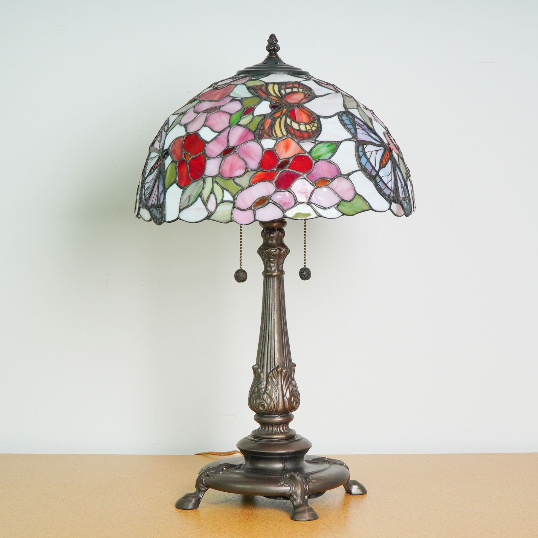 A striking stained glass table lamp featuring a dome shade adorned with colorful butterflies and floral motifs in hues of red, pink, orange, and green. The intricate glasswork is hand-cut and soldered, creating a warm and vibrant glow when illuminated. It rests on an ornate cast metal base with a dark bronze finish and twin pull-chain switches for dual bulb operation. A classic decorative accent that brings timeless Art Nouveau charm to any interior.