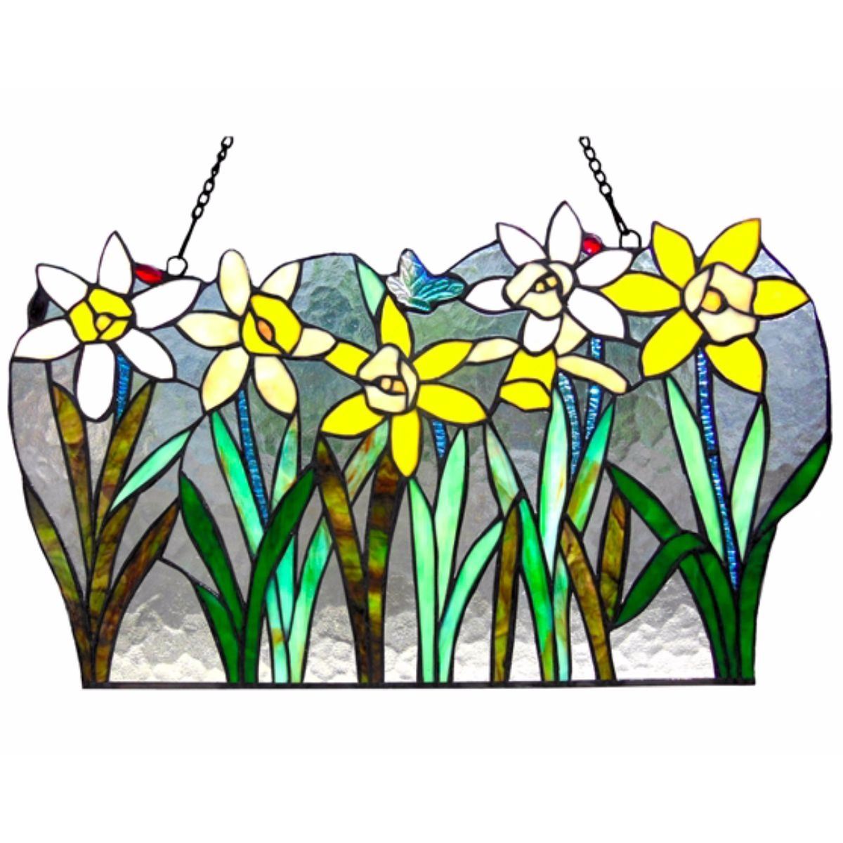 Tiffany-style stained glass hanging panel, in the form of yellow & white flowers in a garden with butterfly. Created with 241 glass cuts & glass beads wrapped in copper with textured black finish & hanging chain. 23" W X 14" H.