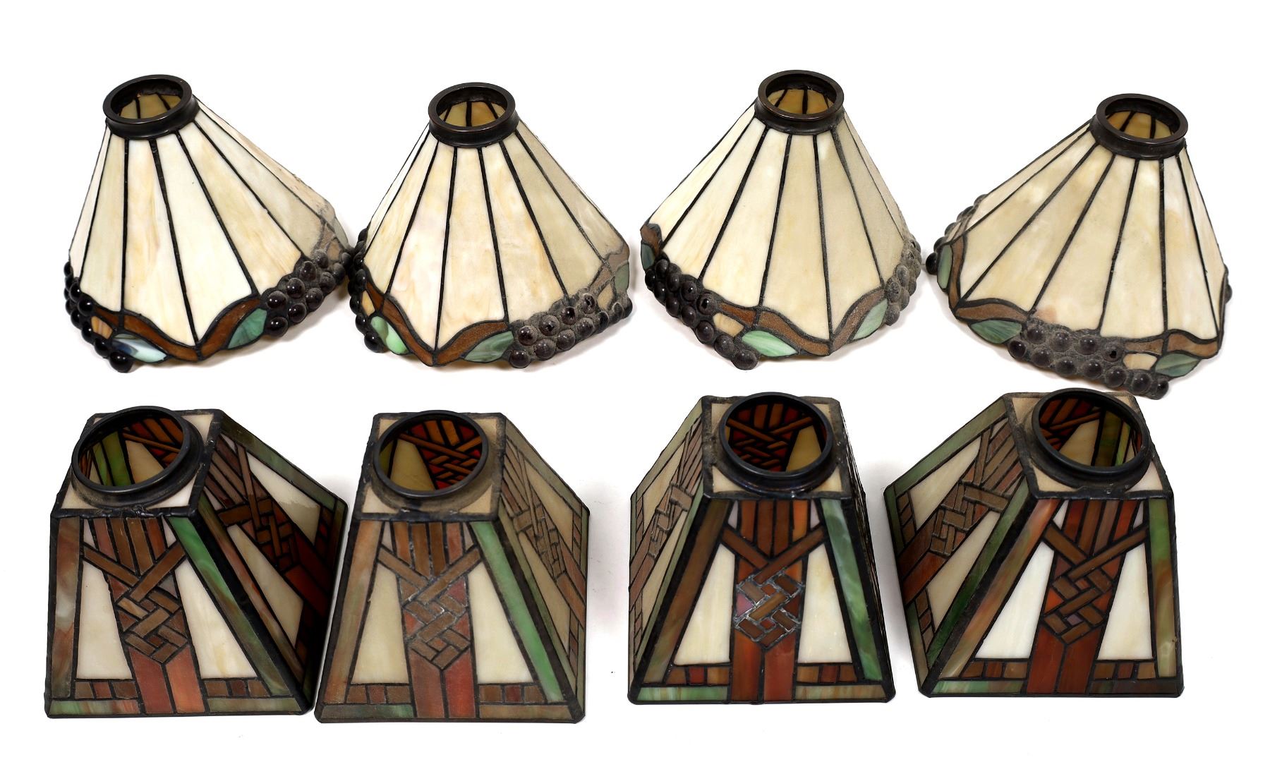 This lot contains two large stained glass lamp shades 16 in. in diameter in a grape and leaf design; four square shaped lamp shades in the Prairie design at 5 1/2 in. across with a 1 3/4 in. opening on the top; and four circular lamp shades in the grape and leaf pattern as well at 8 in. in diam. with a 1 3/4in. opening for mounting at the top. All pieces are cut glass of late manufacture. Two lamp fixtures are included at 23 in. in height cut for the two larger lamps shades. A stained glass window accessory at 10 1/2 in. X 42 1/2 in. is included of a young woman with grapes in her hand. All