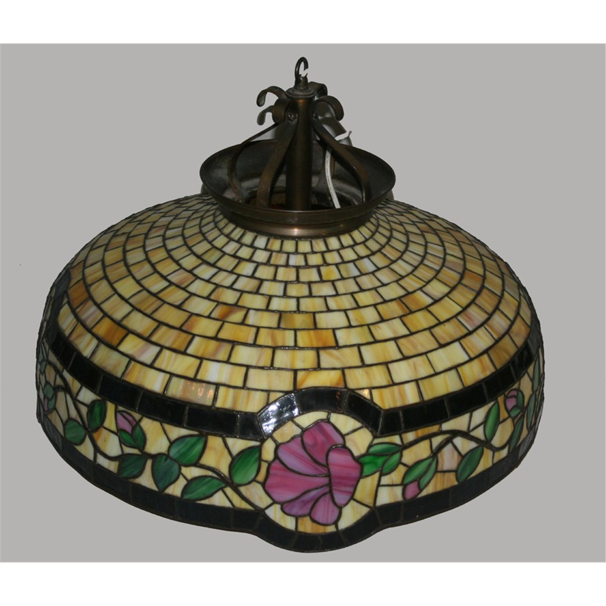 Hanging stained glass lamp shade in spider web design with pink flowers forming an irregular border. Wired and ready to go. Approx. 20.5" D.