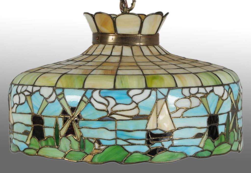 1940s. Shade depicts ship and windmills. Three tight glass breaks but no repairs. Decorative Lamp Condition (Excellent). Size 24" Dia.
