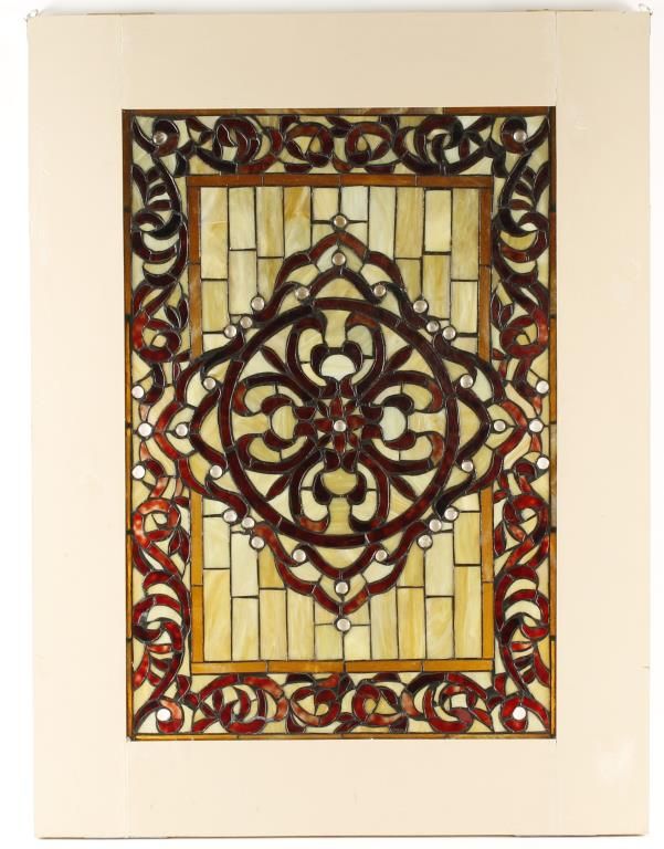 In shades of yellow and red with clear glass beads. In peach colored wood frame. 27-1/2" wide x 36-3/4" high.