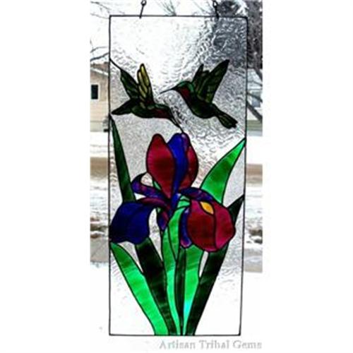 Brilliant magenta and rich sapphire-colored tones of this unique iris becomes the home of these magnificent hummingbirds and will become become an instant showstopper radiating color beams throughout your room! One can almost hear the fluttering as this family goes about their evening meal...