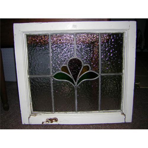 Very nice red, yellow, and green flower shape in center of this stained, leaded glass window. Has no cracks. Looks beautiful hanging in front of a window.