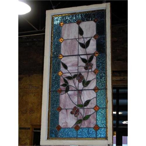 OLD Stained Glass Window with Flowers! Excellent condition. Measures 48 by 27 1/2 by 2 inches deep. Wonderful vibrant colors! This beautiful window is located in our premiere antique store in Lincoln, NE.