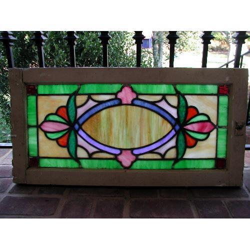 Vibrant stained glass window from England mid 19th century. Beautiful creamy yellow marbleized background with dark and light hues. Green marbleized border with design in blue,pink marbleized,lavender,rose marbleized,pink,deep green accents with orange. Each small block in the four corners is deep red which have a bit of the frame cream paint atop. The frame antique white paint on one side is quite old showing cracks,the other side a tan. Easily sanded and repainted to desired color. Stunning hung with two chains interior or exterior if not used as a window. Excellent condition with no chips,cracks or missing glass.Measures 32L X 16H X 3D.