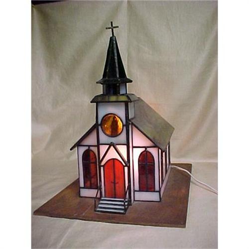 More than 100 individual pieces of cut glass and 10 different colors of glass have been expertly leaded and shaped to form this classic New England country church. Electrical wiring very nicely done. When lit, the figure of the praying Mother is illuminated as well as the leaded windows and doorways.