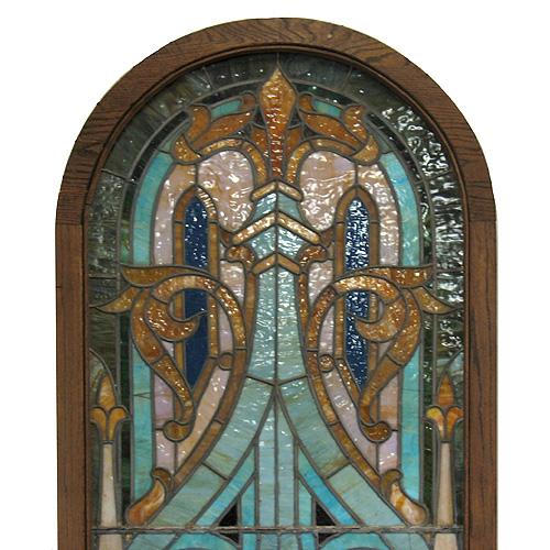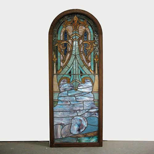 Stained glass window; arched top; abstract design; in oak frame; C.1900; 90" high x 35 1/2" across (a few early cracks)