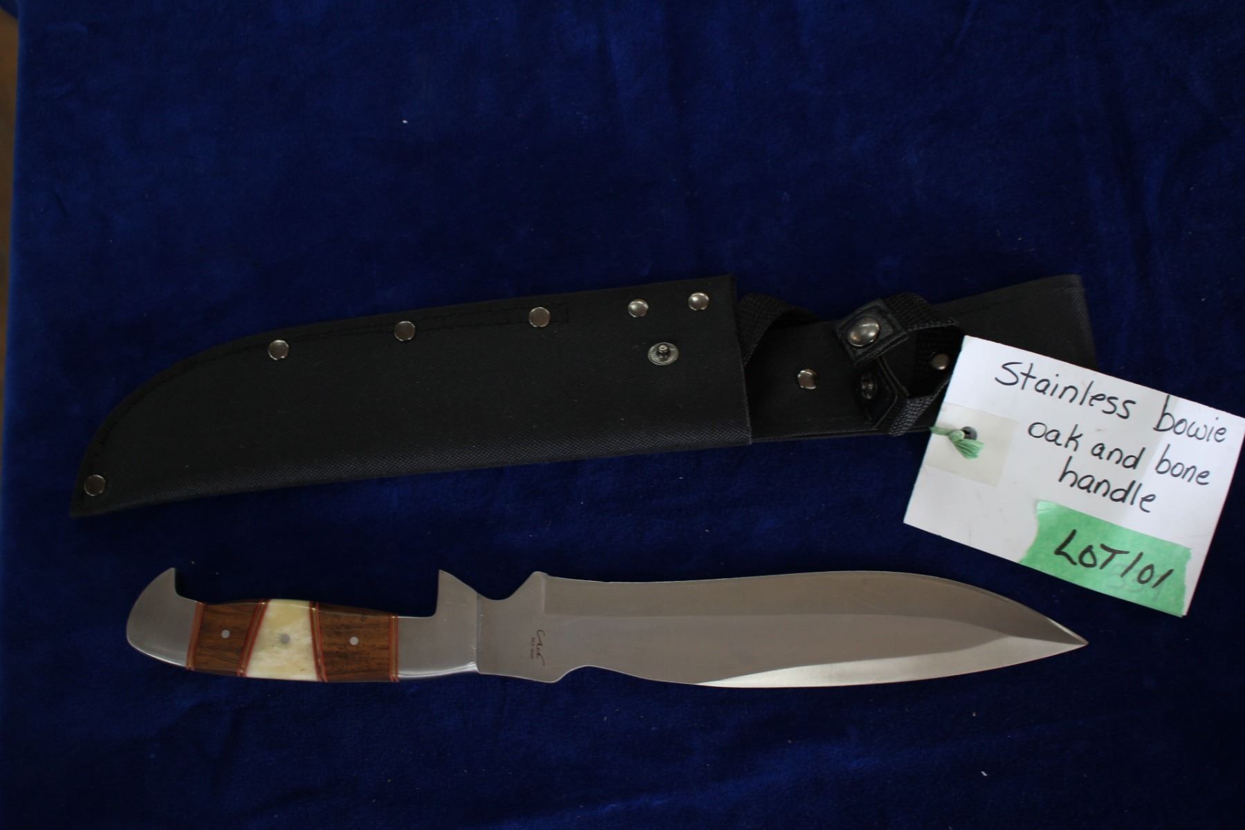 Stainless Bowie, Ash 440 Steel, 8" Blade, Oak & Bone Handle, Sheath