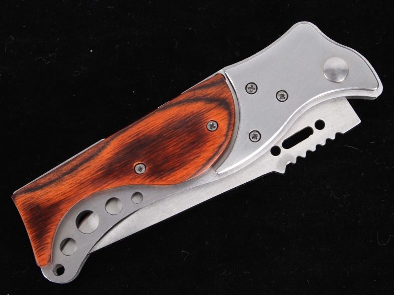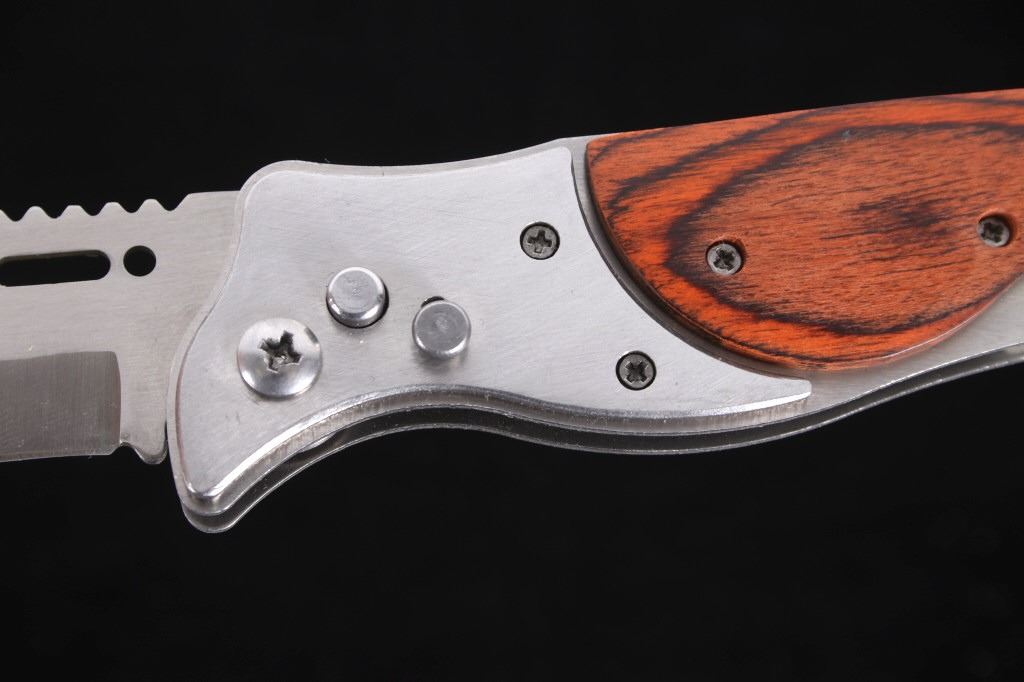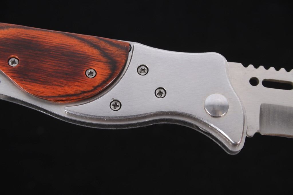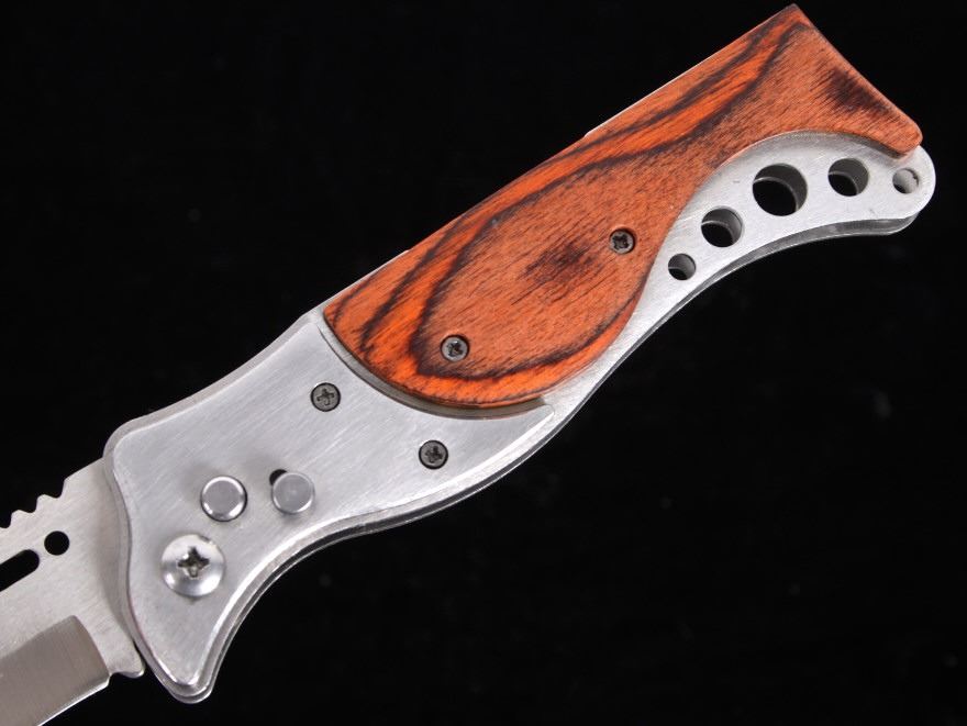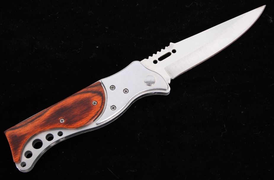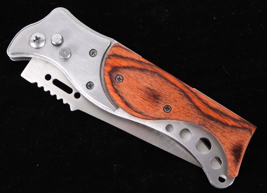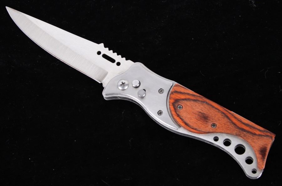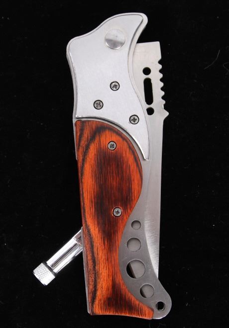 Featured in this lot we have a stainless steel clip point switchblade knife and flashlight. The knife features a stainless steel clip point single edged blade with a flashlight along the back of the grip. The knife shows steel bolster scales with wooden grip scales with a red wood finish. The back of the grips show a compact flashlight with a twist activation. The knife shows good condition with little to no wear. The knife measures 9 1/2" long with the blade being 4 1/4" long. The knife measures 5 1/4" long closed.