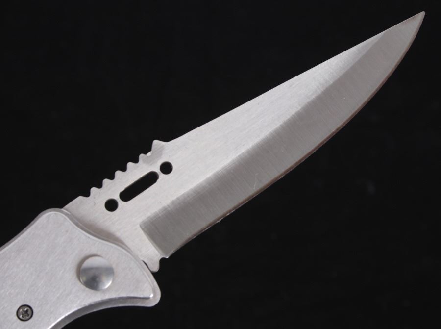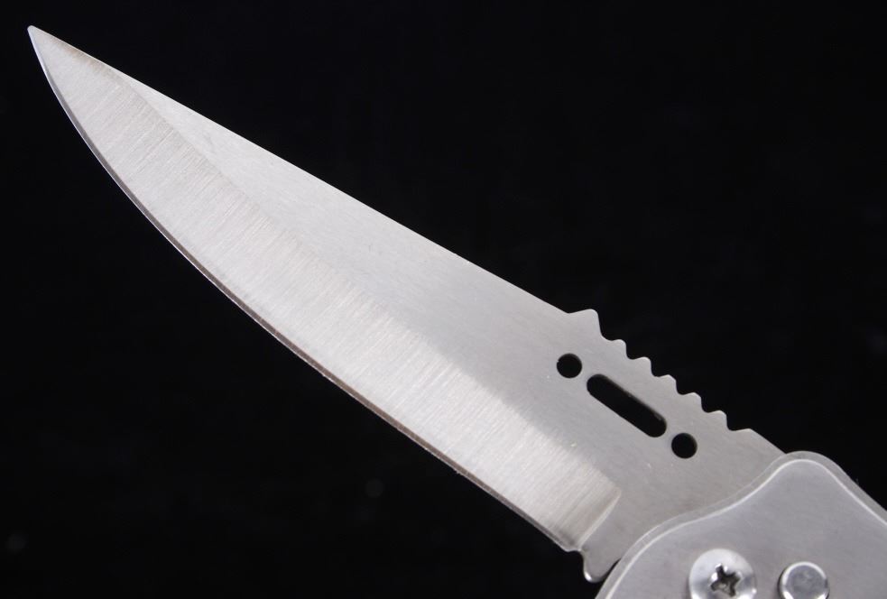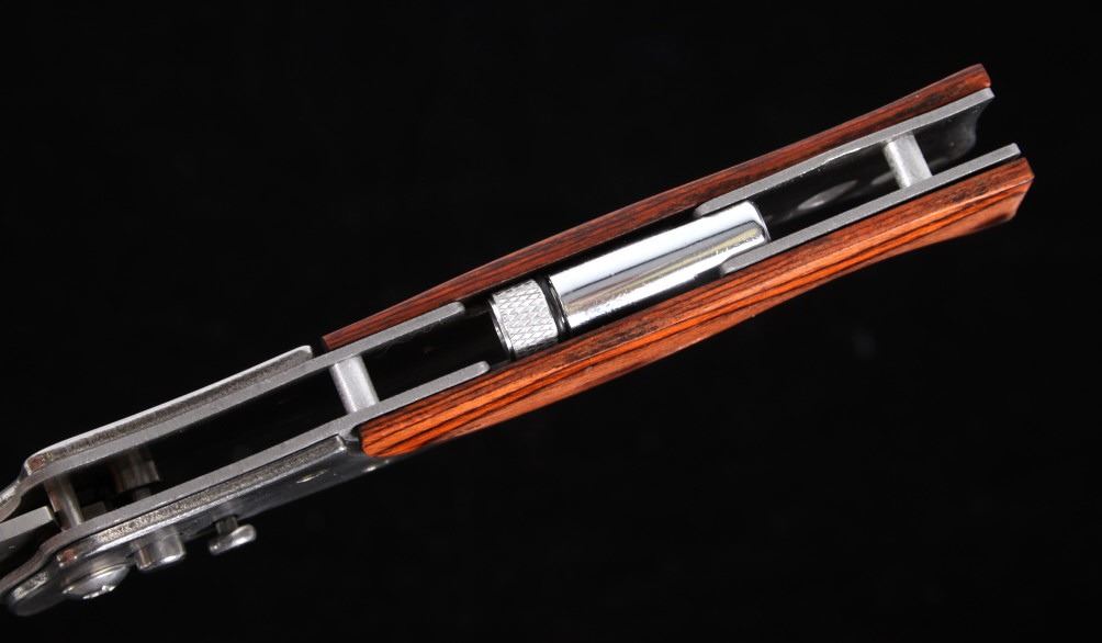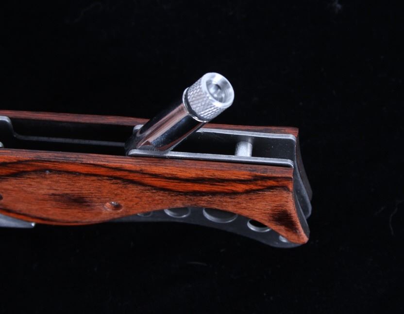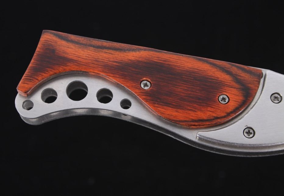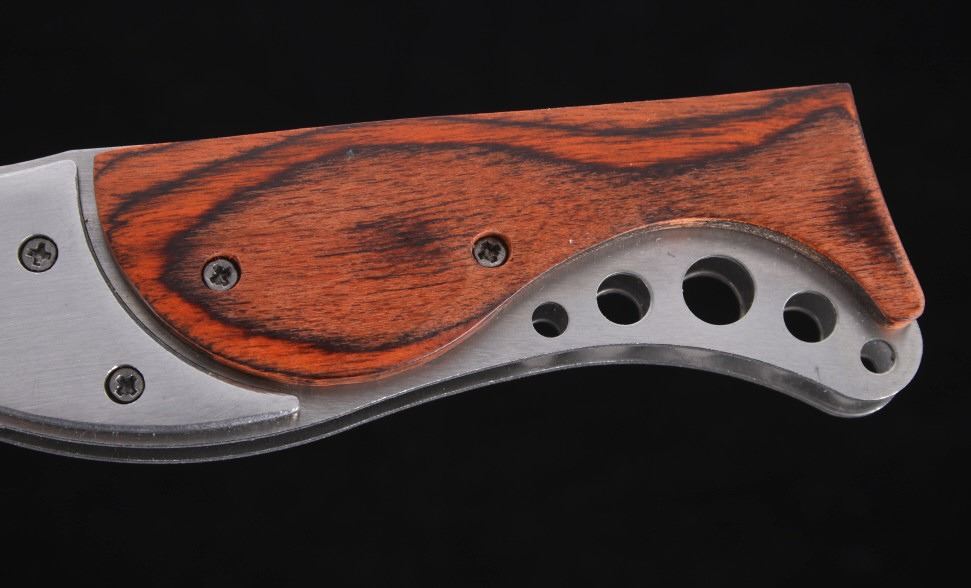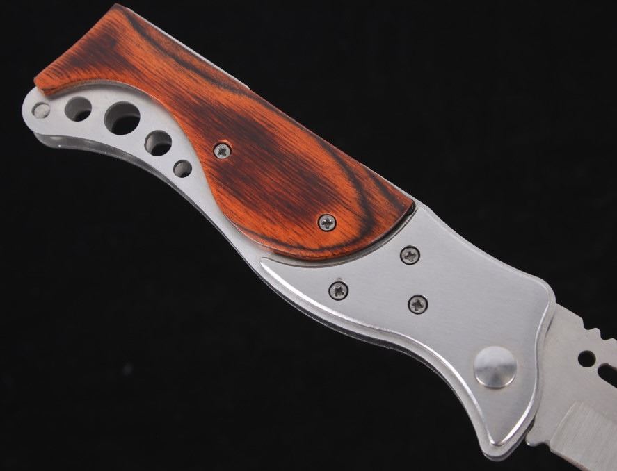 Featured in this lot we have a stainless steel clip point switchblade knife and flashlight. The knife features a stainless steel clip point single edged blade with a flashlight along the back of the grip. The knife shows steel bolster scales with wooden grip scales with a red wood finish. The back of the grips show a compact flashlight with a twist activation. The knife shows good condition with little to no wear. The knife measures 9 1/2" long with the blade being 4 1/4" long. The knife measures 5 1/4" long closed.