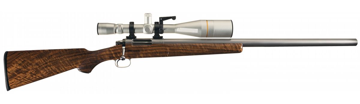This rifle has a heavy matte stainless steel barrel with a 1 in 12 inch twist (appropriate for bullet weights of 65-80 grains) chambered for the popular and record setting 6mm PPC round. There is a Rifle Basix trigger installed which has a light and crisp pull. Mounted on a beautifully figured Bastogne walnut pistol grip stock with wide forearm and multi-point checkered wrist, a steel grip cap and a factory buttpad. The stock is bedded to the receiver with the barrel free floated. There is a silver Leupold VX-III 6.5-20x50mm Long Range scope installed to the receiver with Talley quick release rings. Comes with a scope level, screw on lens caps, a 3 inch sunshade and a scope box. The consignor states that it is a Douglas match barrel.