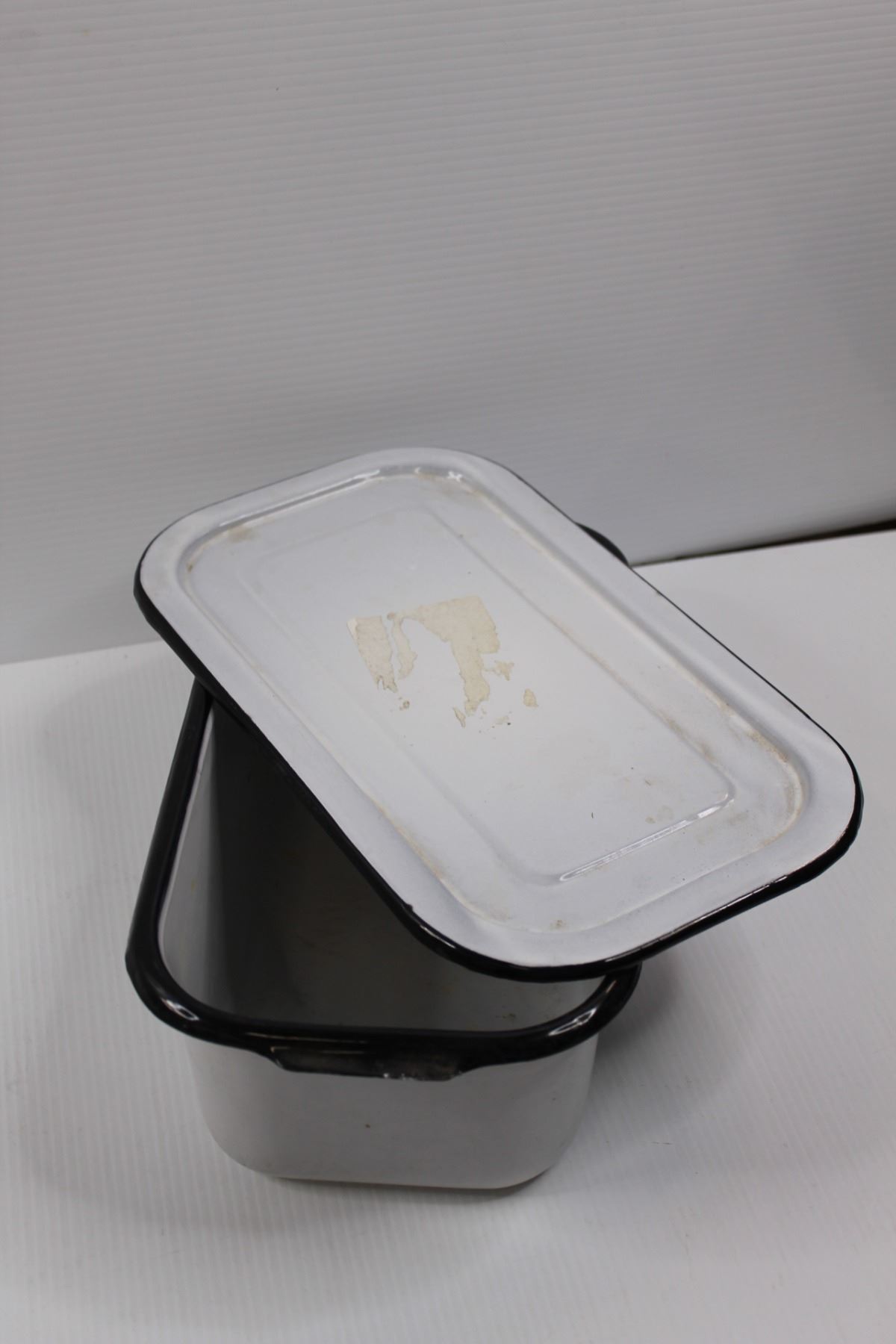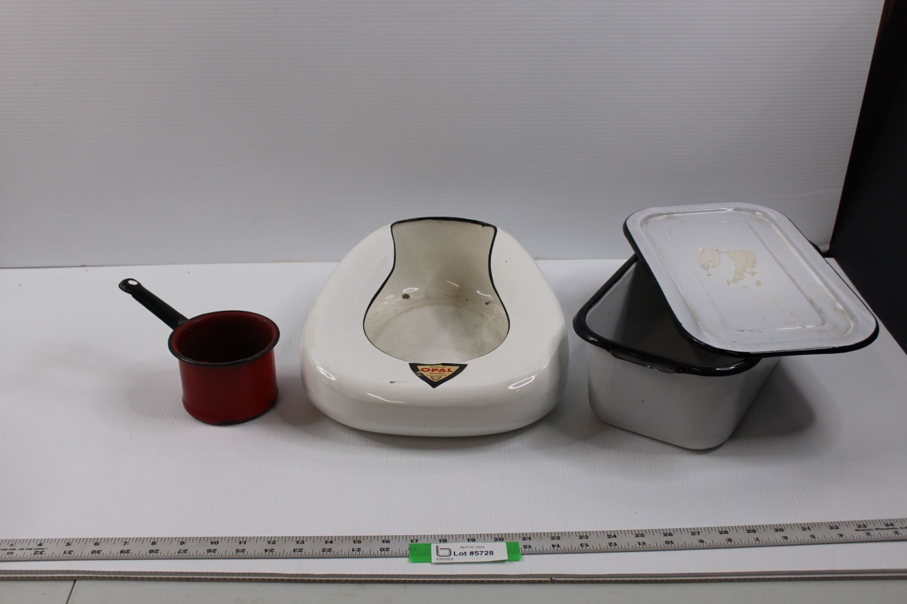 Stainless Opal Ware Bed Pan, Pot & Rectangular Pan w/Lid - All Enamel Coated Steel (Few Chips on Red Pot)