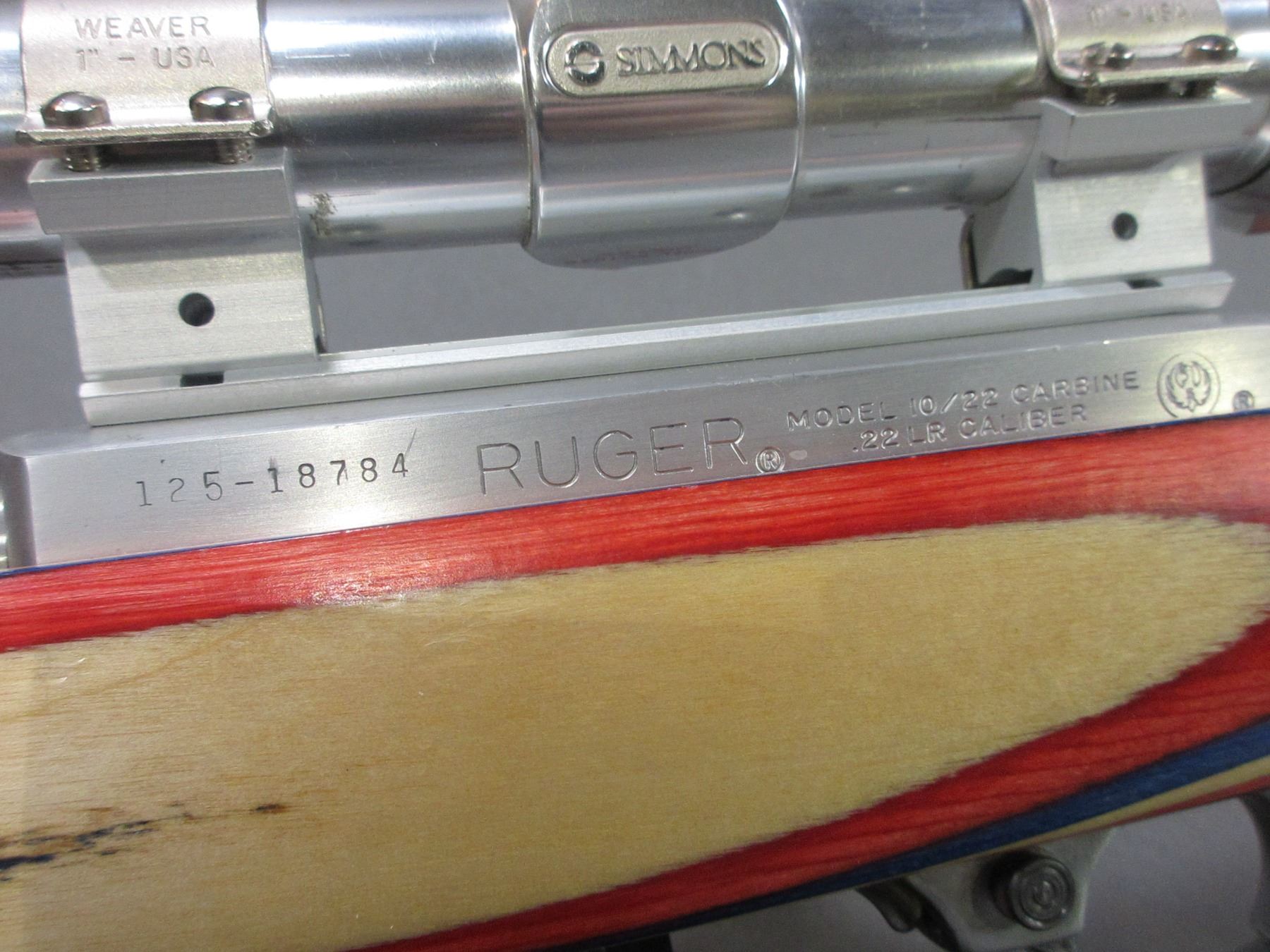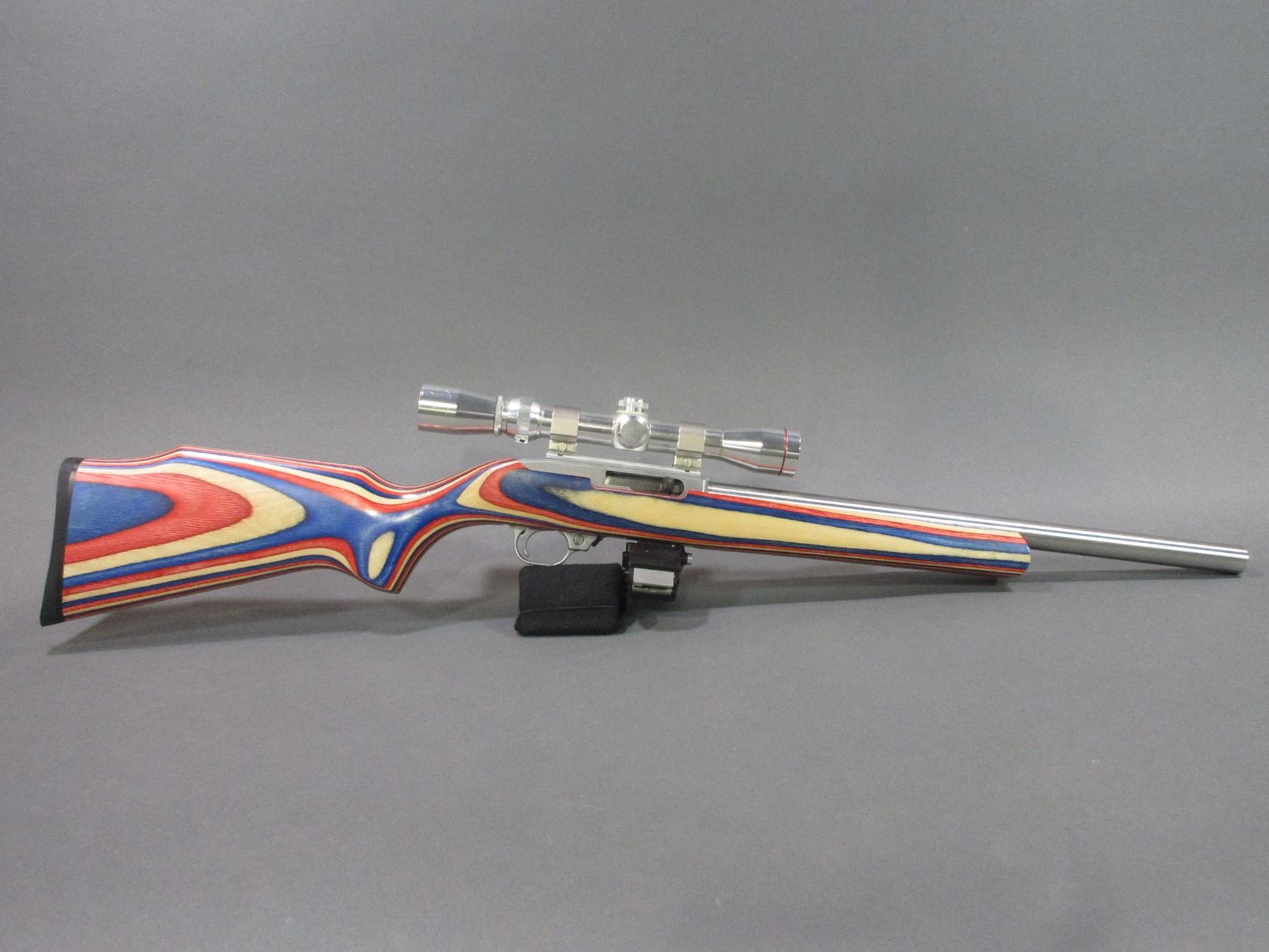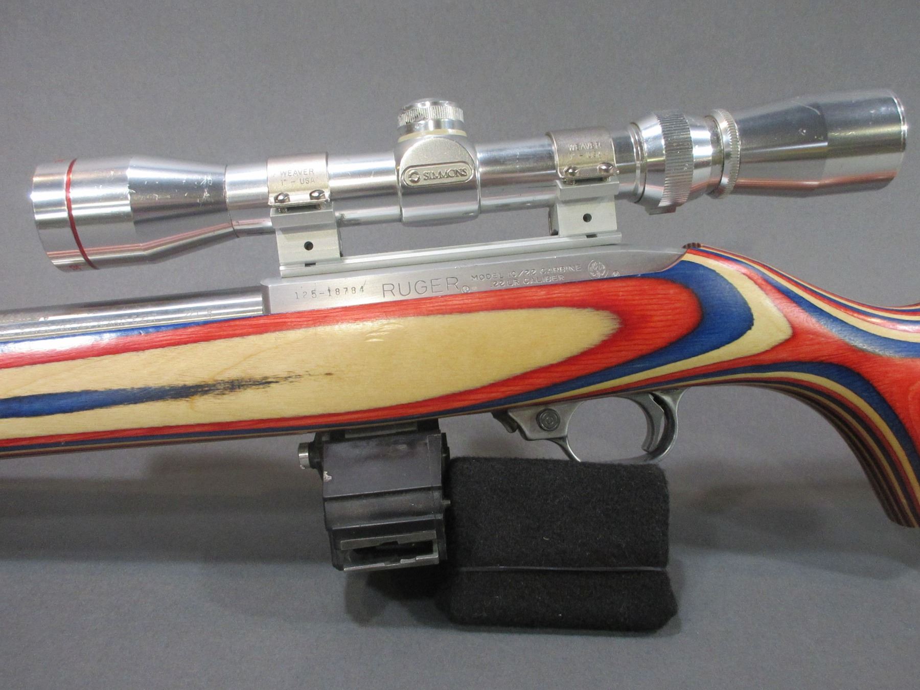 Stainless Ruger Model 10/22 Carbine- .22LR- 18" Midway Bull Barrel- Laminated Stock And Forearm- Triple Mag- Simmons 3X9 Scope- Excellent Condition- #125-18784
