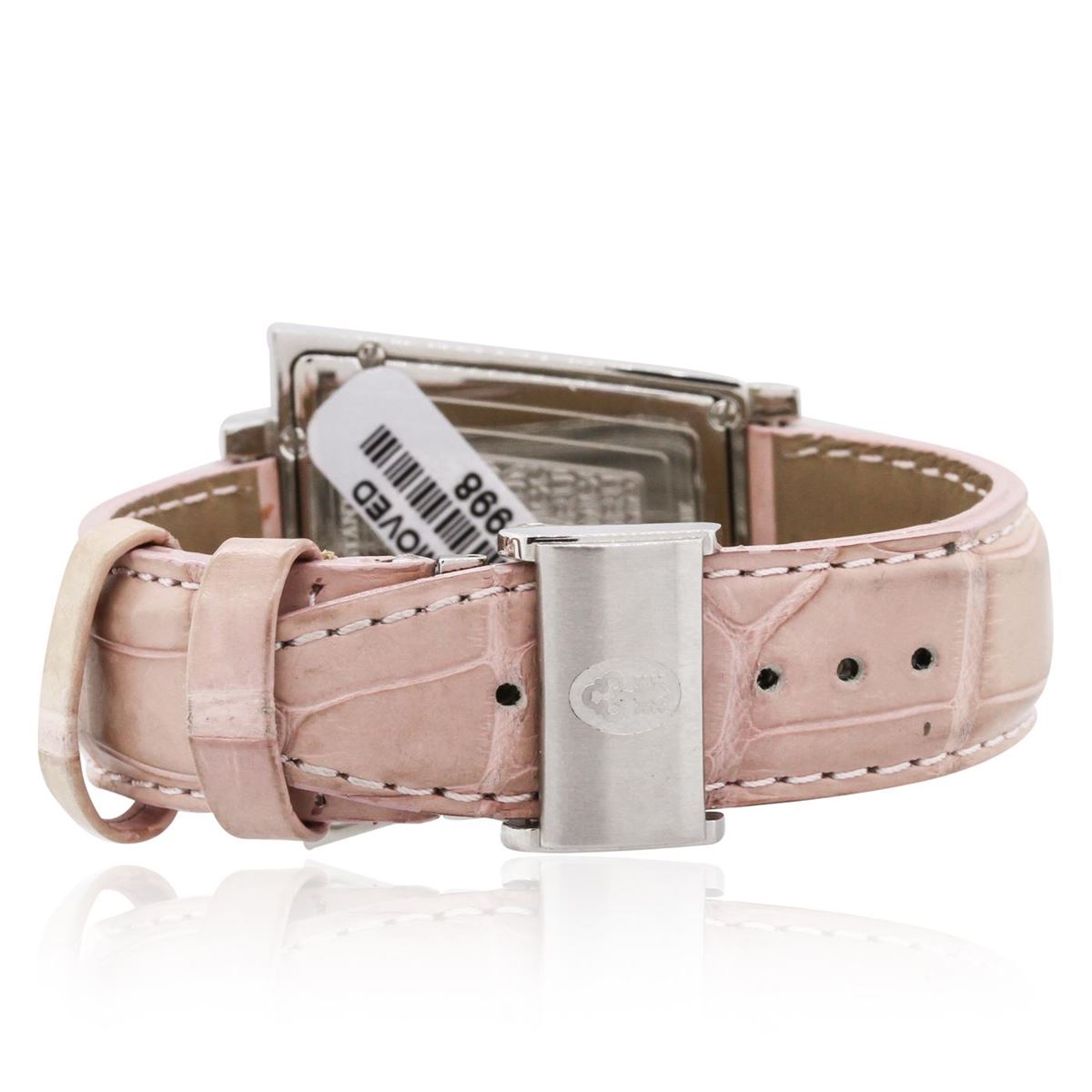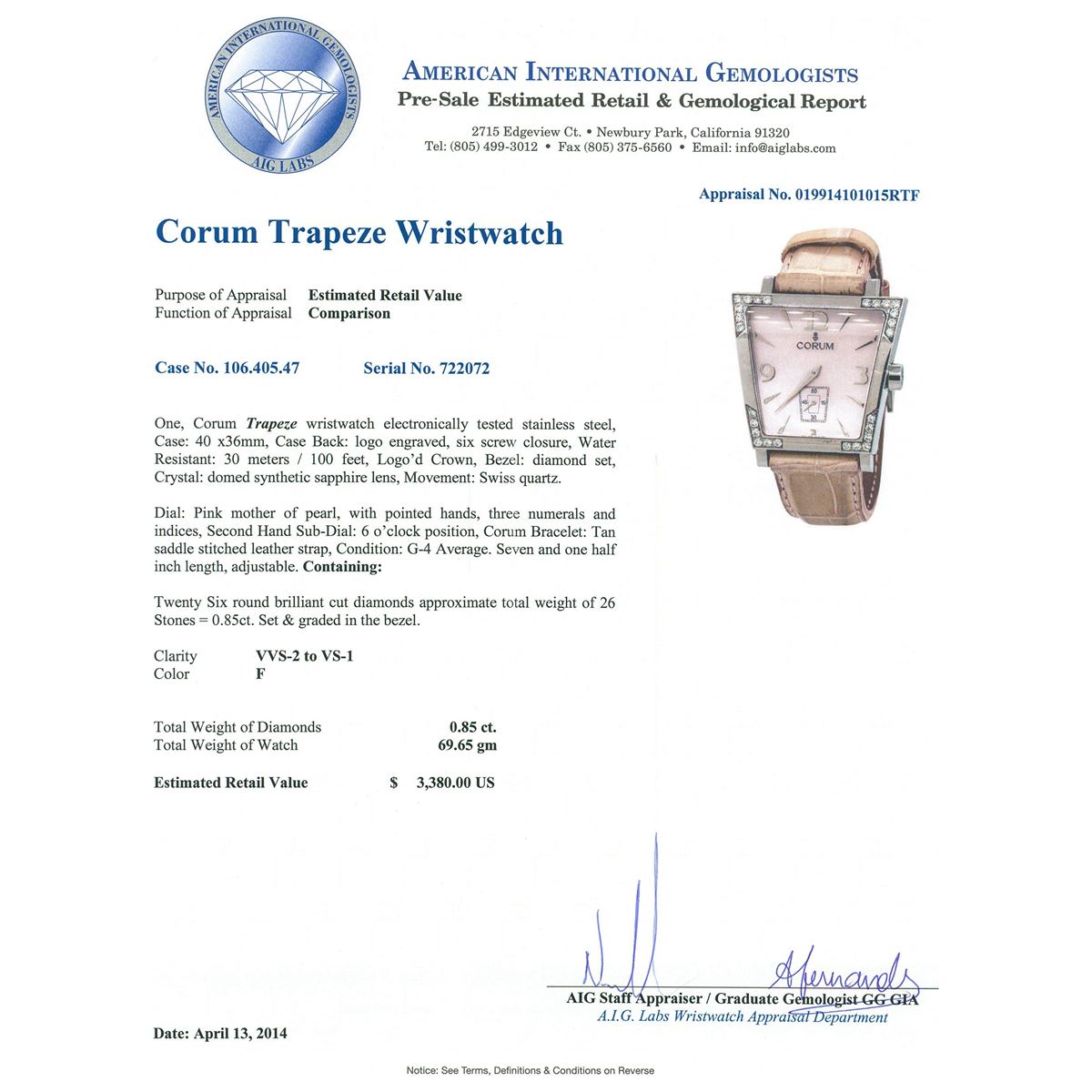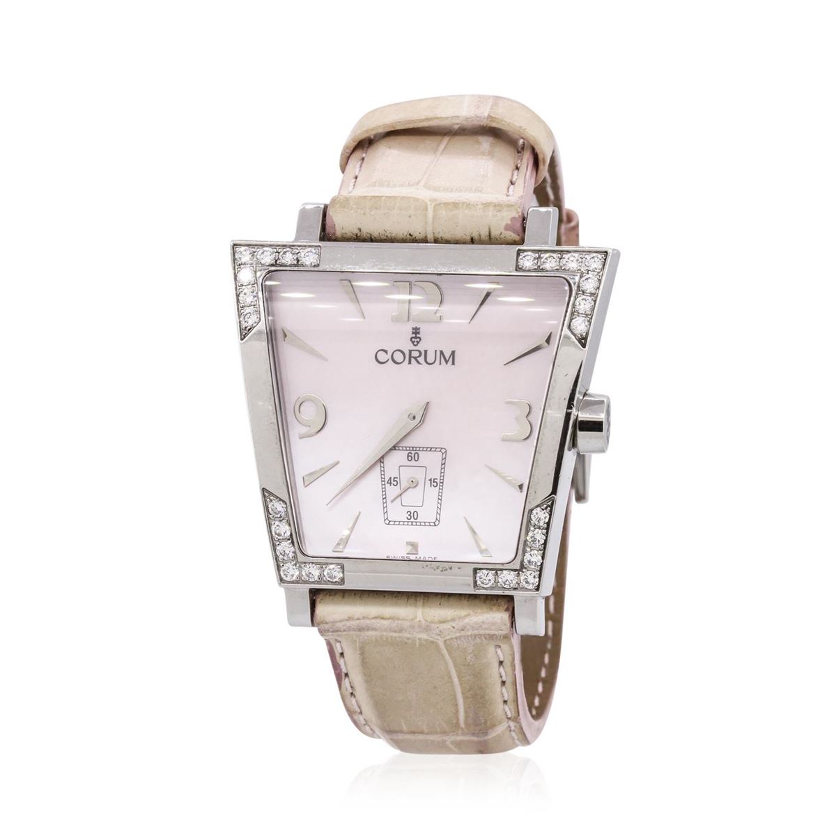 One, Corum Trapeze wristwatch electronically tested stainless steel, Case: 40 x36mm, Case Back: logo engraved, six screw closure, Water Resistant: 30 meters / 100 feet, Logo'd Crown, Bezel: diamond set, Crystal: domed synthetic sapphire lens, Movement: Swiss quartz. Dial: Pink mother of pearl, with pointed hands, three numerals and indices, Second Hand Sub-Dial: 6 o'clock position, Corum Bracelet: Tan saddle stitched leather strap, Condition: G-4 Average. Seven and one half inch length, adjustable. Containing: Twenty Six round brilliant cut diamonds approximate. Total Weight of 26 Stones = 0.85ct. Set & graded in the bezel. Clarity: VVS-2 to VS-1. Color: F. Total Weight of Diamonds 0.85ct. Total Weight of Watch 69.65gm. AIG Appraised at $3,380.00.