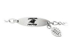 Polished stainless steel 7.5 inch Carolina Panthers Team Name and Logo dangle oval ID bracelet.