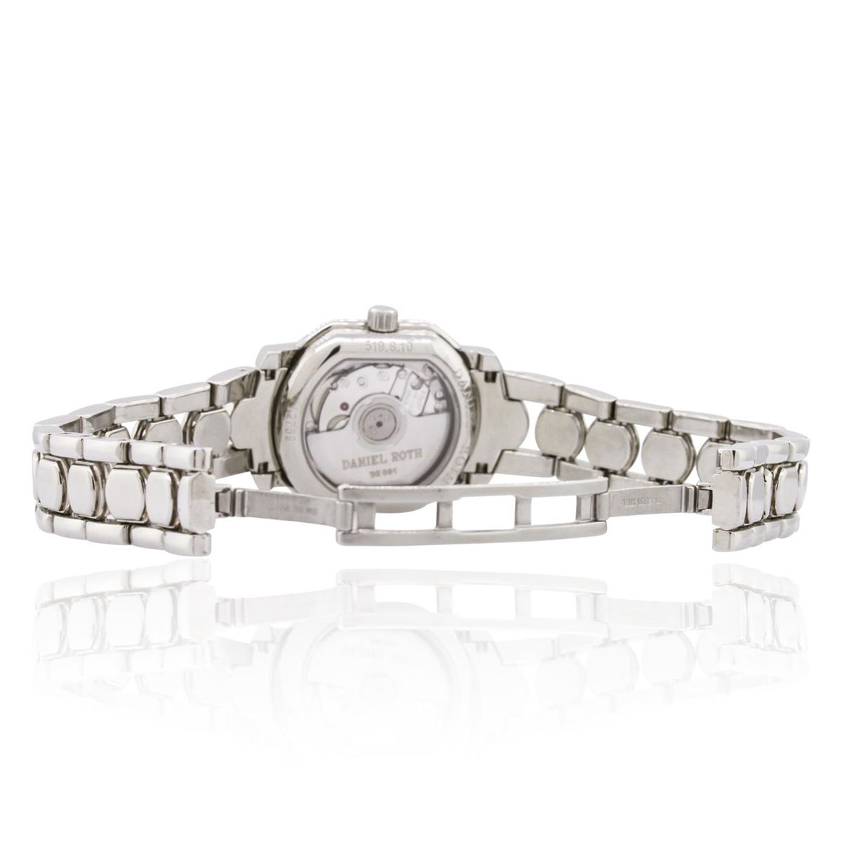One ladies Daniel Roth Luxury Dress Style Wristwatch featuring: Factory Diamond Bezel, Stainless Steel Case, Screw Down Crown, and Lugs, Salmon Guilloche Mother of Pearl Dial with Analog Display, Arabic Numerals, Hour and Minute Hands, Water Resistant to 20m, Mechanical Hand-winding Movement, Steel Bracelet Strap, Sapphire Crystal, 24x21mm, Deployment Clasp.