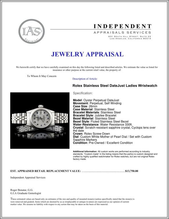 Dial: Custom White Mother of Pearl Dial / Set with Custom Sapphire Markers