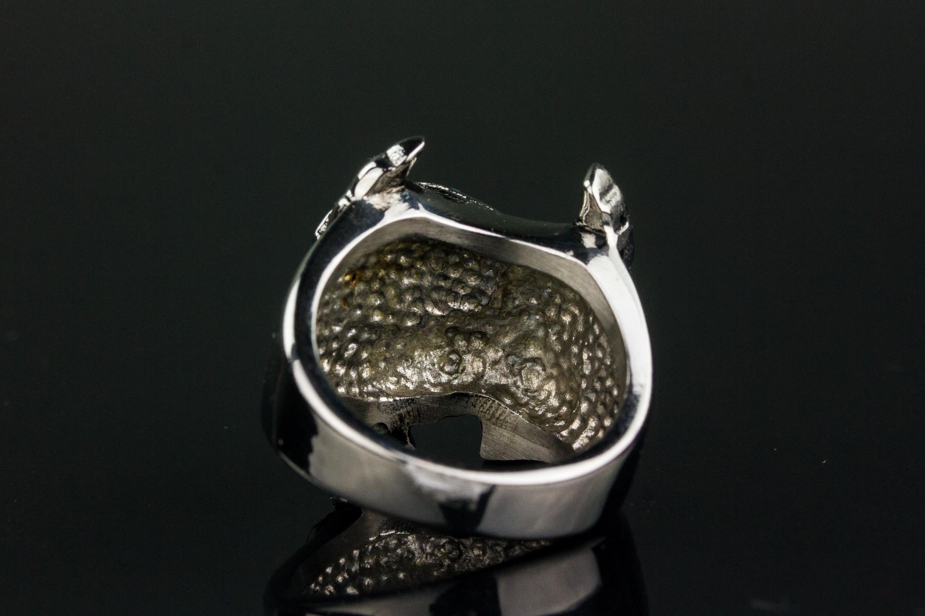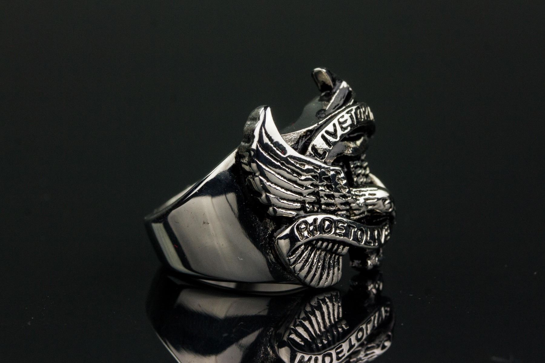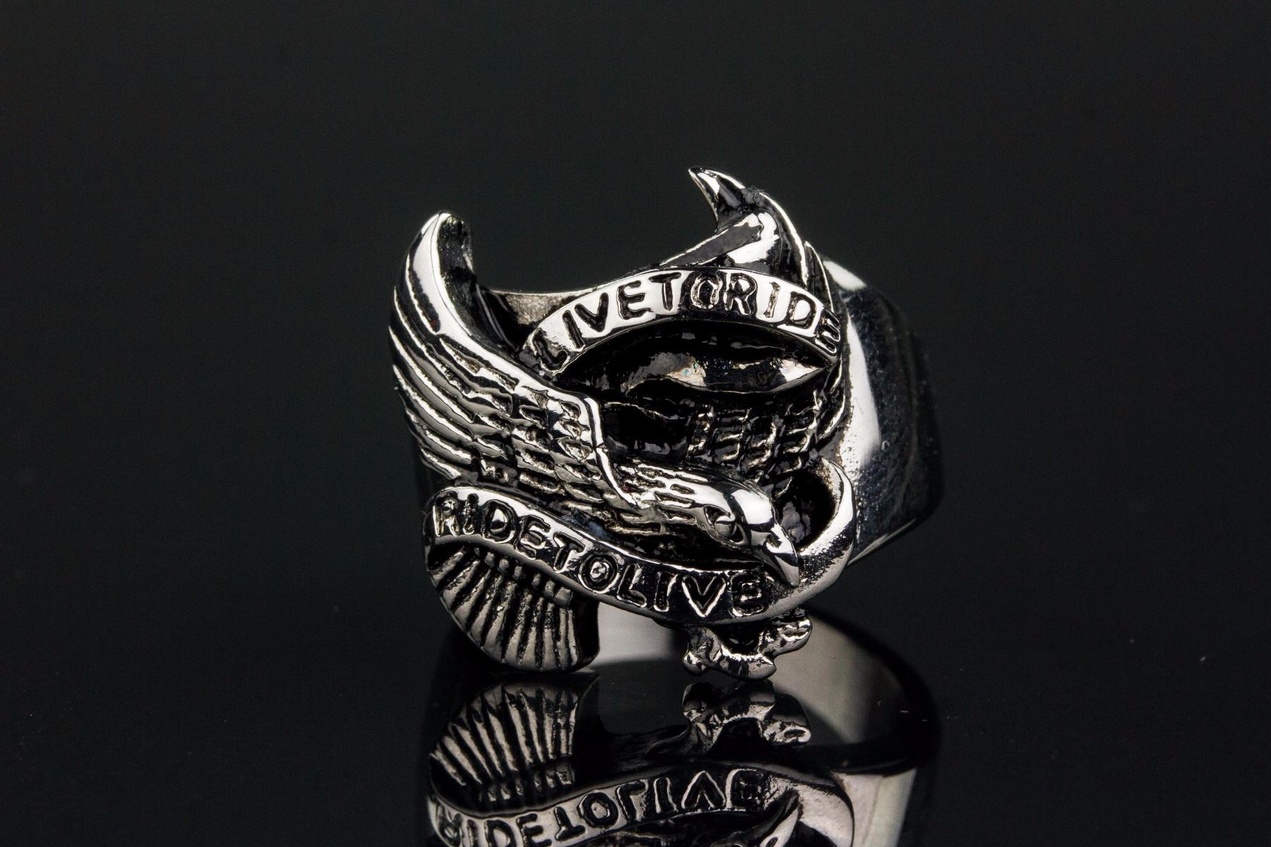 Stainless steel men's rider ring; of flying eagle form; inscribed "live to ride, ride to live"; retail value $60; D: 2.1 cm, 14.75 grams