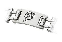 Polished stainless steel 8 inch Miami Dolphins Team Name and Logo ID bracelet.