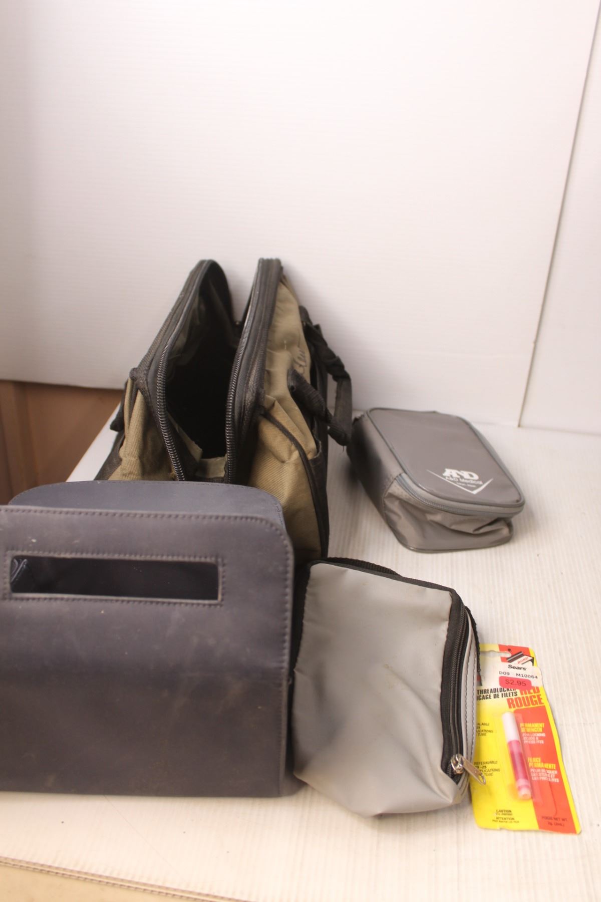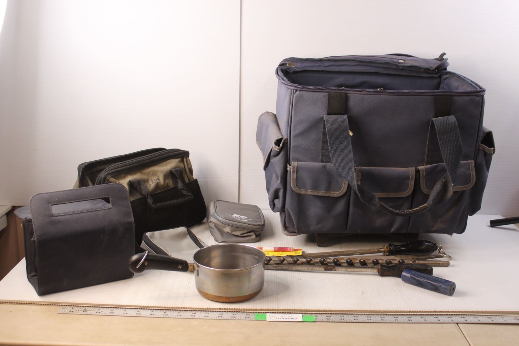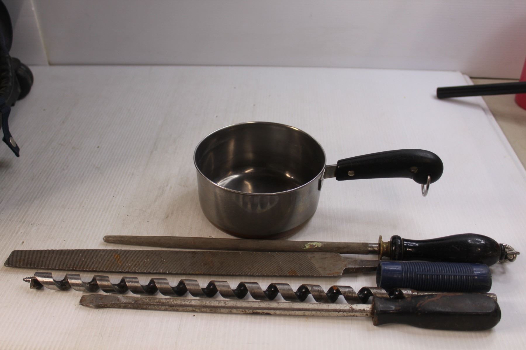 Stainless Steel Pot, (5) Bags, Vintage Tools- Files, Thread Locker, Misc.