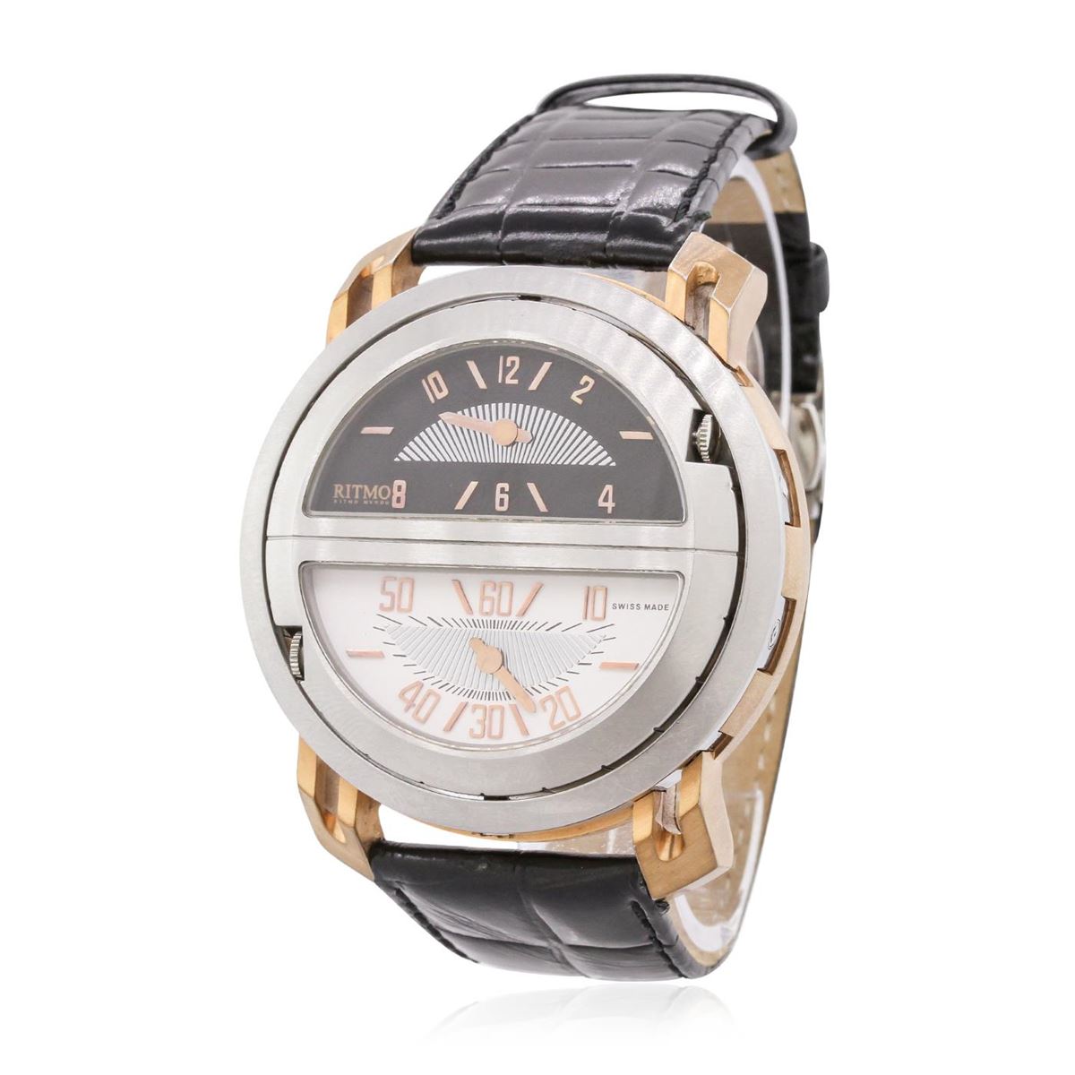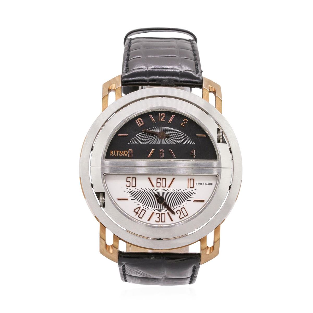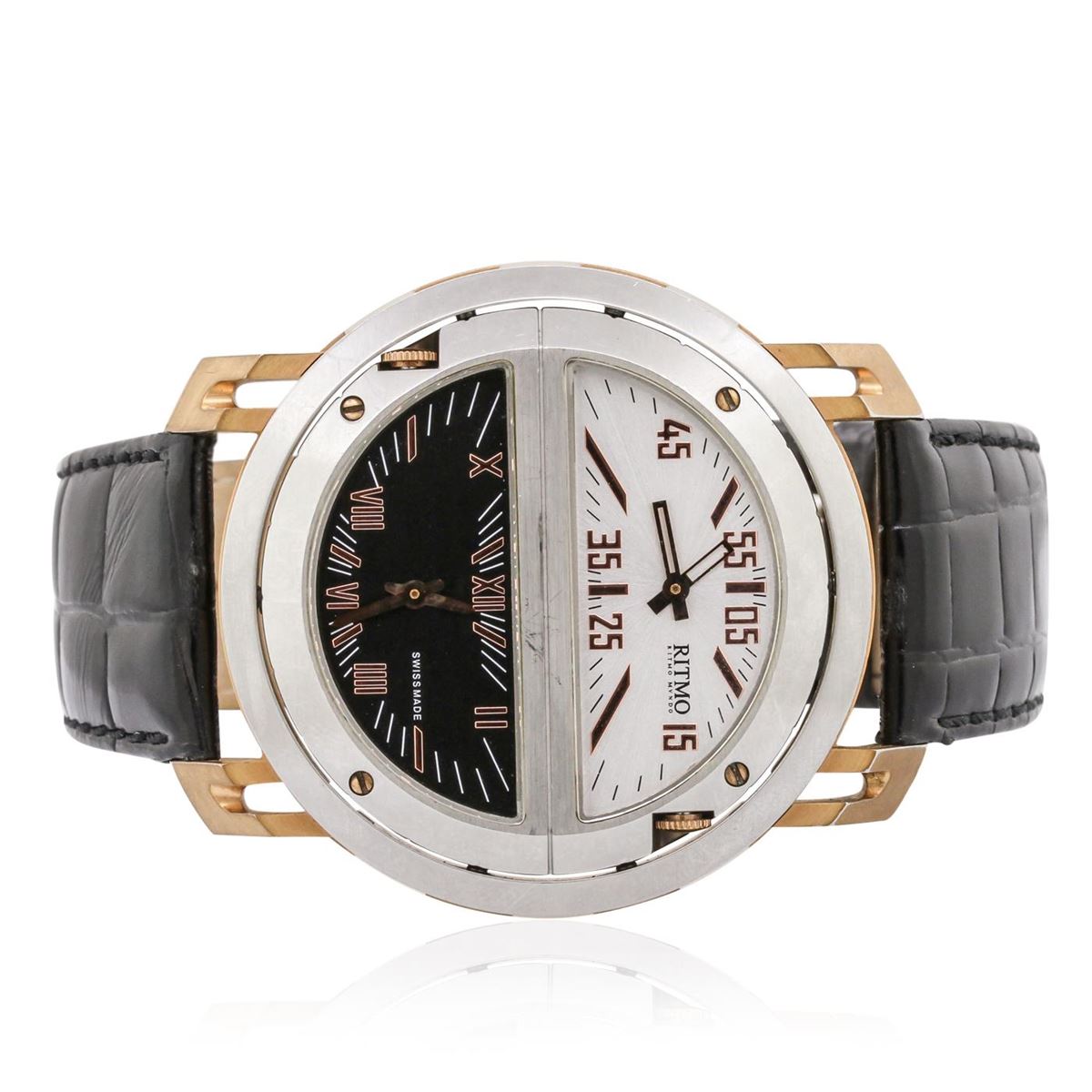 One Gents Stainless Steel Ritmo Mvndo Persepolis Triple Time Model 211 Wristwatch featuring: black leather bracelet with black stitching and steel buckle, stainless steel bezel, lugs, and 52.5mm case, four-section alternating black and white reversible dial with analog display, Roman and Arabic numerals, quartz battery movement, water resistant to 100m, triple time zone, sapphire crystal.