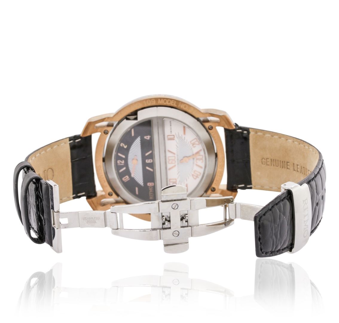 One Gents Stainless Steel Ritmo Mvndo Persepolis Triple Time Model 211 Wristwatch featuring: black leather bracelet with black stitching and steel buckle, stainless steel bezel, lugs, and 52.5mm case, four-section alternating black and white reversible dial with analog display, Roman and Arabic numerals, quartz battery movement, water resistant to 100m, triple time zone, sapphire crystal.
