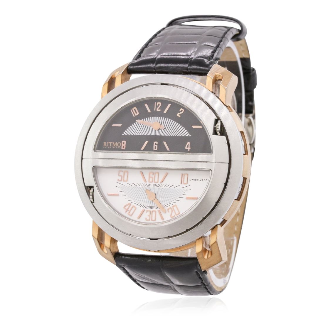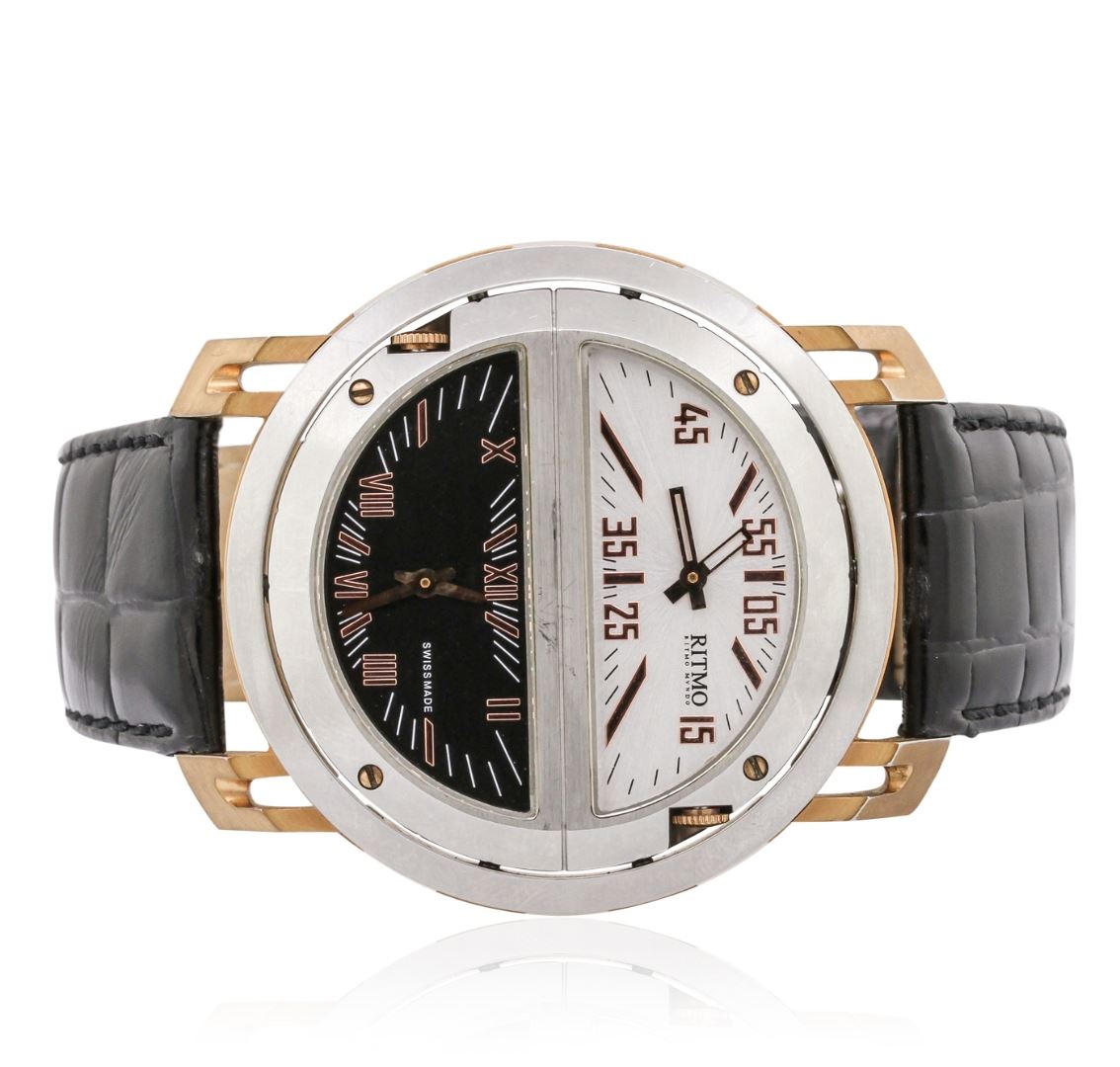 One Gents Stainless Steel Ritmo Mvndo Persepolis Triple Time Model 211 Wristwatch featuring: black leather bracelet with black stitching and steel buckle, stainless steel bezel, lugs, and 52.5mm case, four-section alternating black and white reversible dial with analog display, Roman and Arabic numerals, quartz battery movement, water resistant to 100m, triple time zone, sapphire crystal.