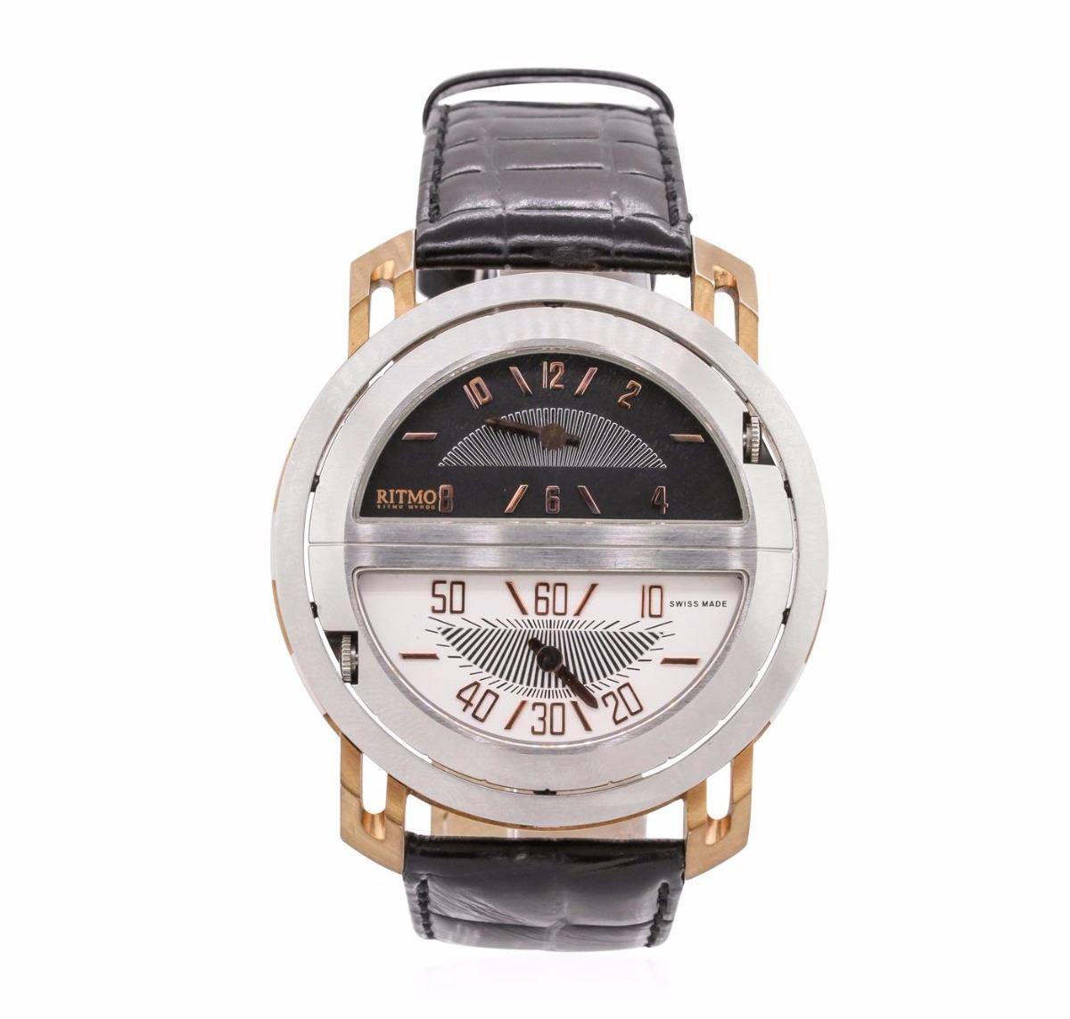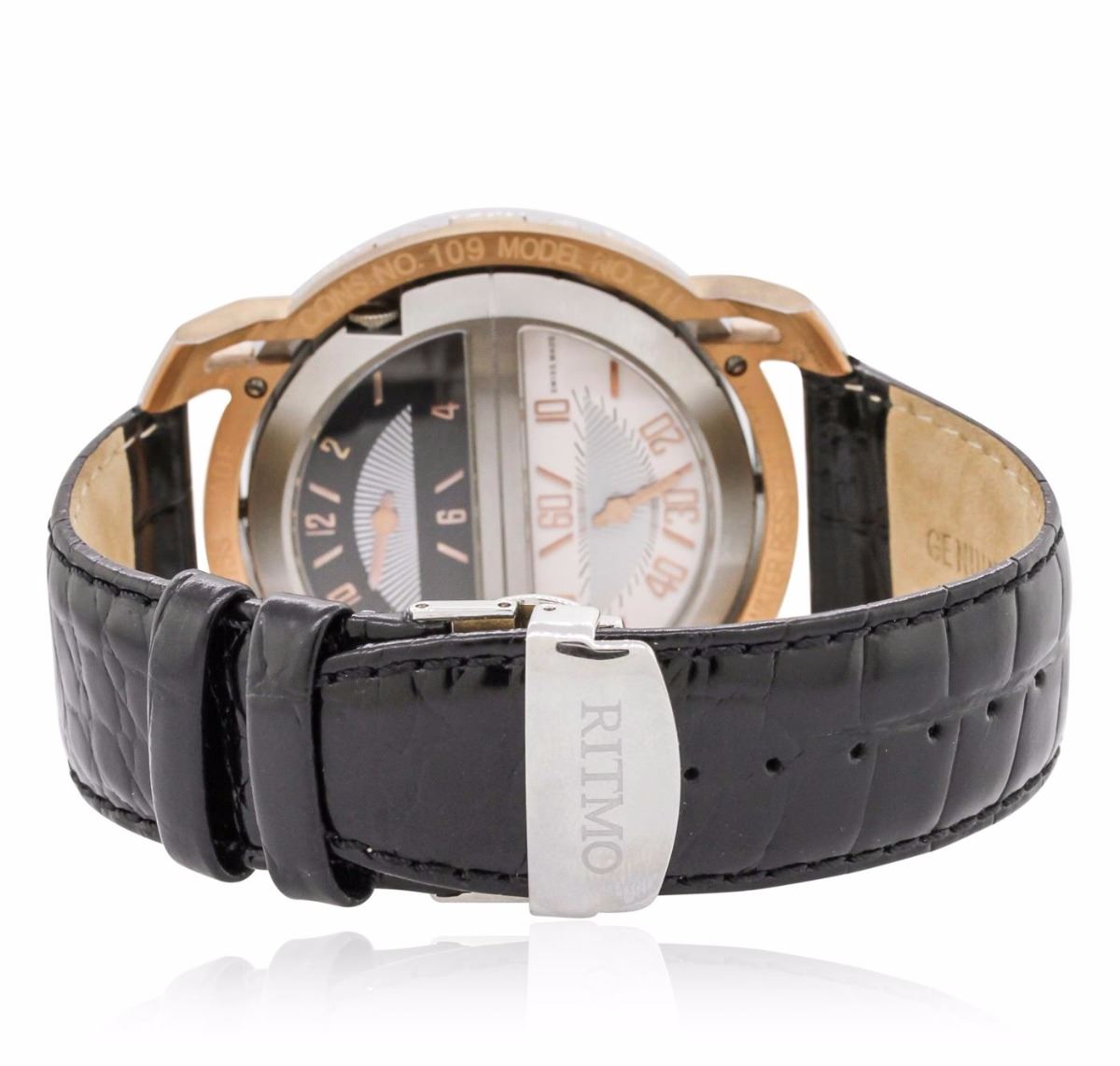 One Gents Stainless Steel Ritmo Mvndo Persepolis Triple Time Model 211 Wristwatch featuring: black leather bracelet with black stitching and steel buckle, stainless steel bezel, lugs, and 52.5mm case, four-section alternating black and white reversible dial with analog display, Roman and Arabic numerals, quartz battery movement, water resistant to 100m, triple time zone, sapphire crystal.