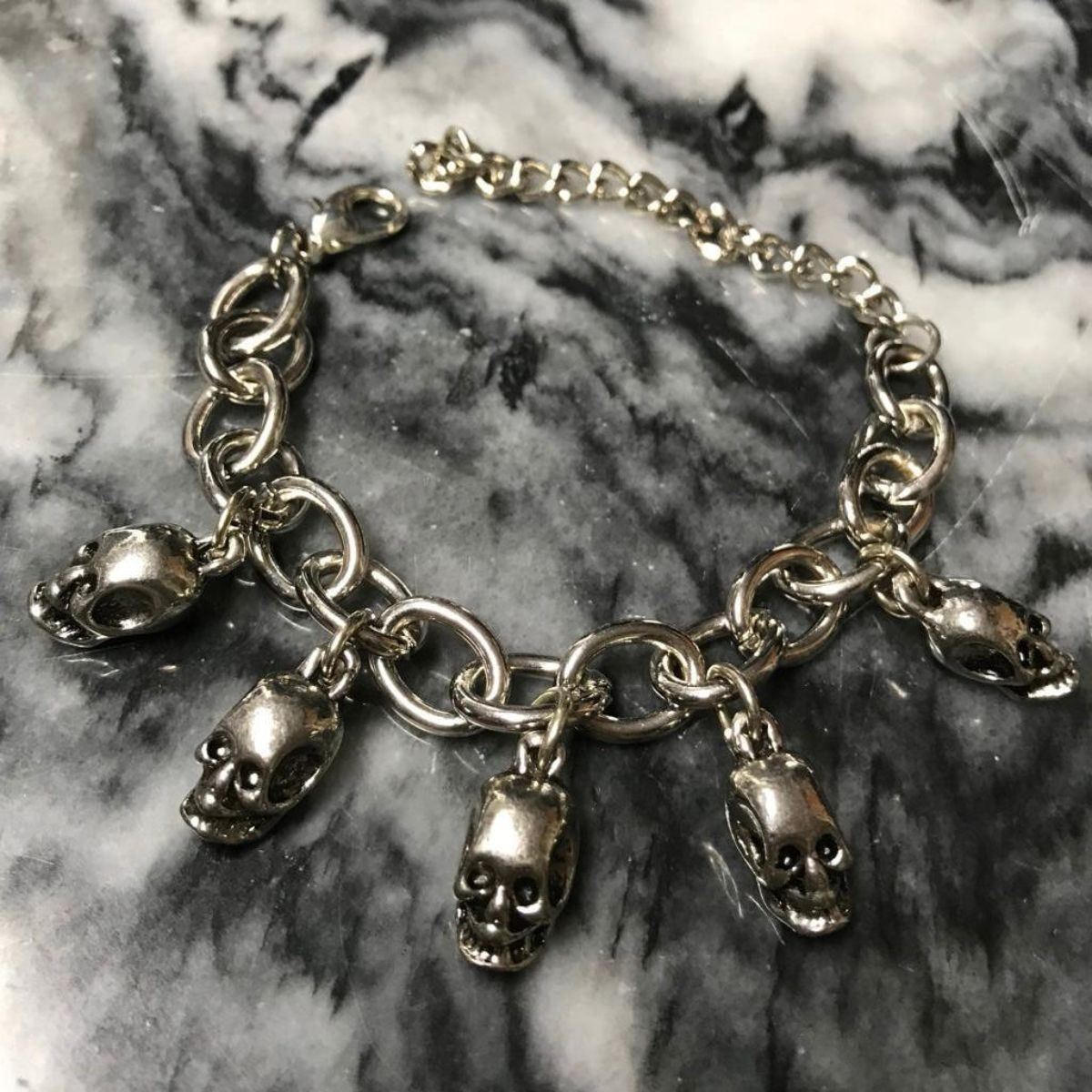 Stainless steel skeleton skull unisex motorcycle bracelet with 5 dangling stainless skulls. 6"- 9" adjustable length.Â