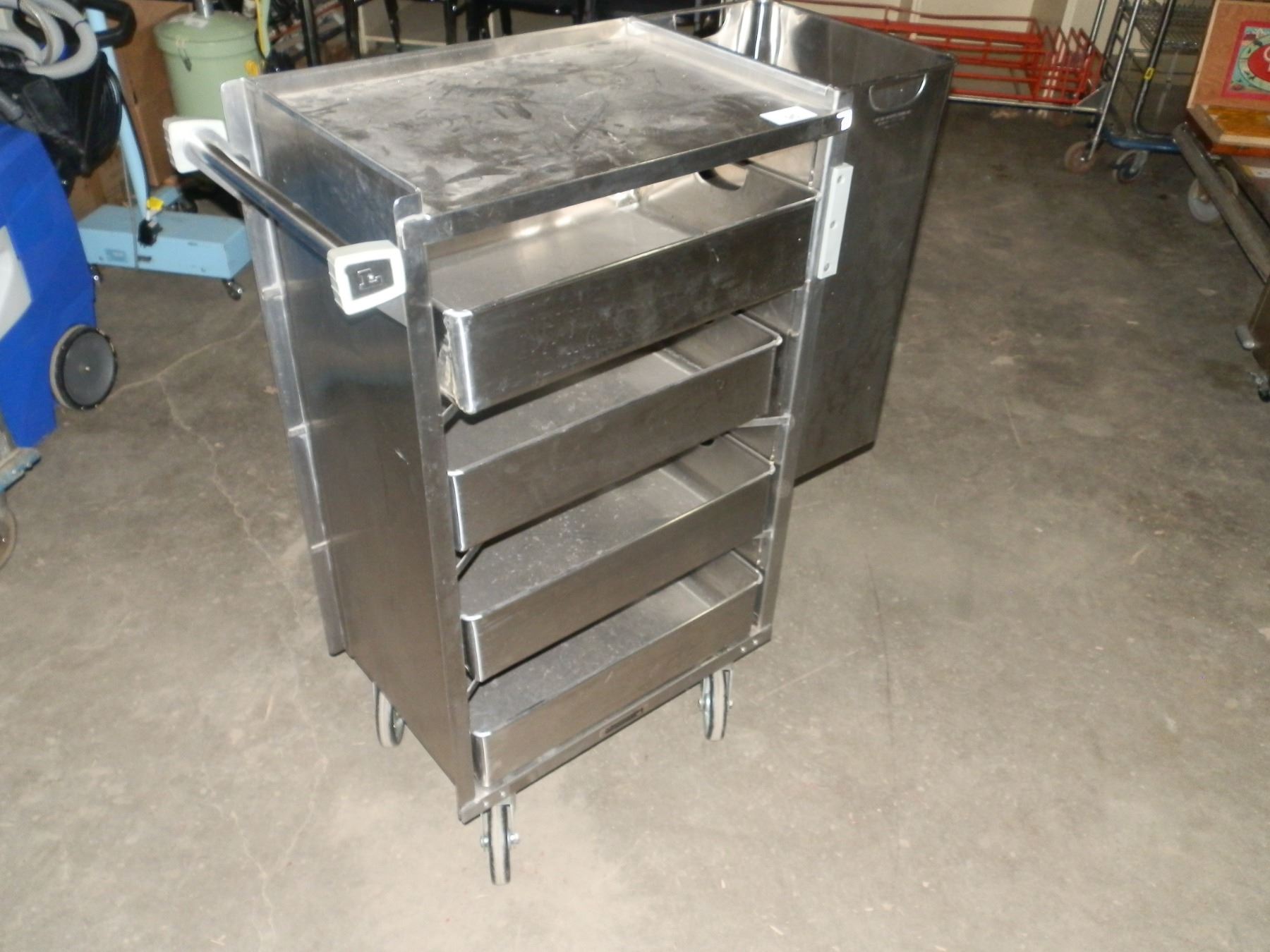 Stainless Steel Storage Cart on wheels, has 4 drawers and a trash can...used