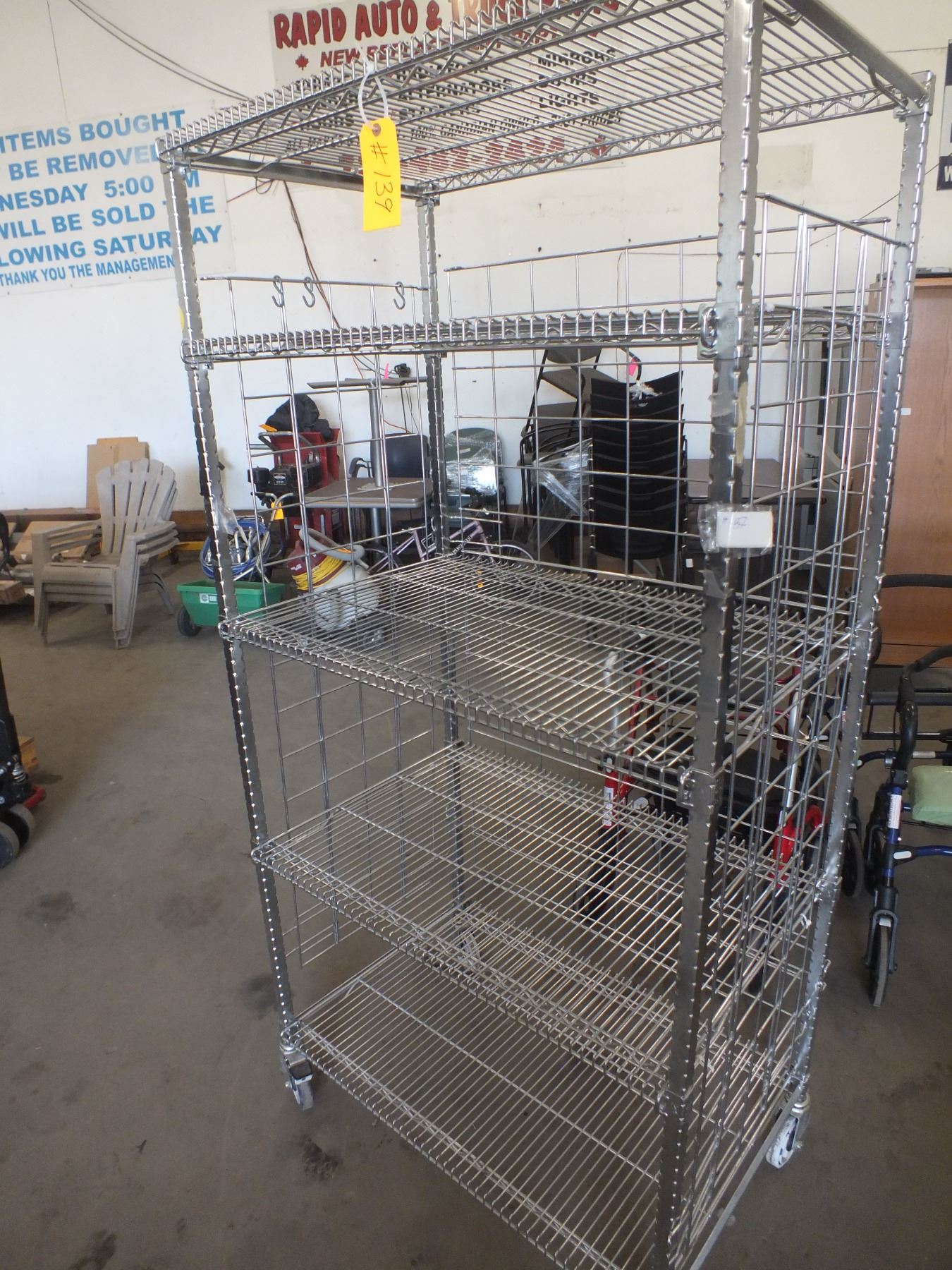 Stainless Steel Storage Rack On Wheels, has a bad wheel, 37"l 23 1/4"w 77 1/2"h...used